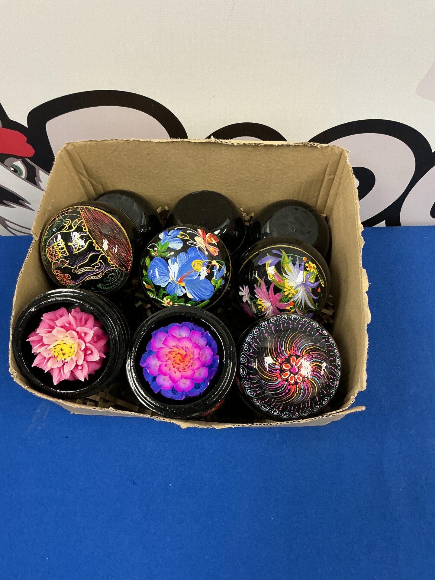 This charming lot features a collection of beautifully preserved wax flowers, each encased in a clear protective dome. These delicate floral arrangements are designed to release a subtle, long-lasting fragrance, adding a touch of vintage elegance to any space. The flowers exhibit a variety of colours and intricate detailing, showcasing the artistry of their creation.