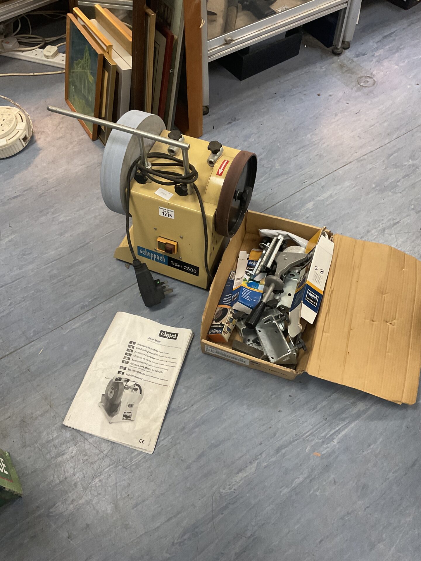 This Scheppach Tiger 2500 wet grinder shows signs of use consistent with its age and purpose. It is offered in found condition, and its functionality is not assessed. This grinder may appeal to collectors of vintage workshop tools, or those seeking a robust machine for restoration or continued use.