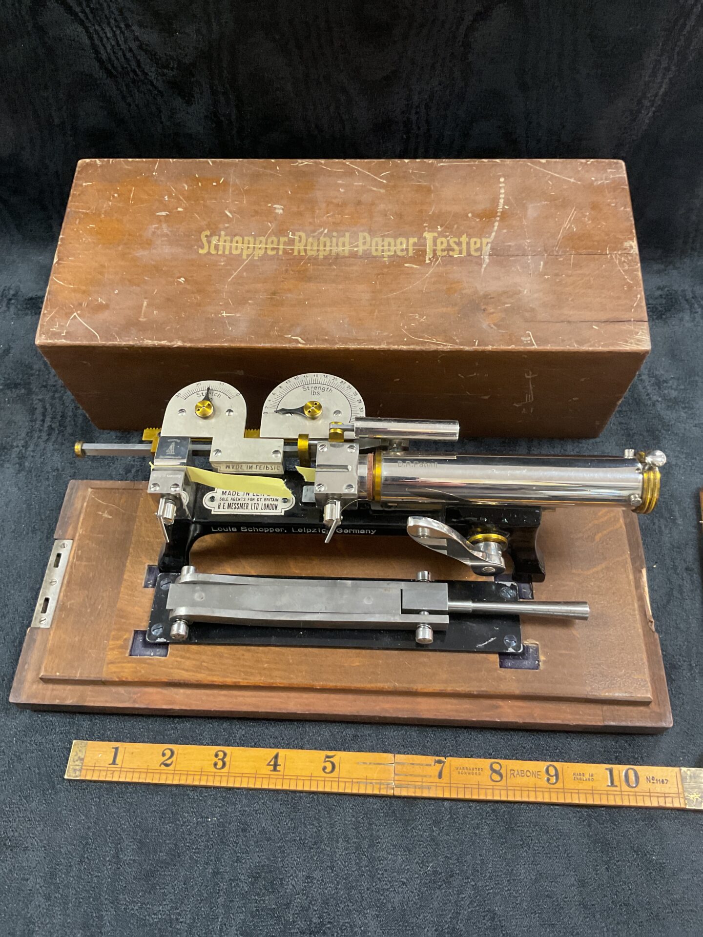 The tester shows signs of age and use, with wear to the wooden case and some patina to the brass components. It is presented as a vintage item, and its functionality is not assessed. This Schopper rapid paper tester would be of interest to collectors of scientific instruments, paper industry memorabilia, or those interested in the history of papermaking.