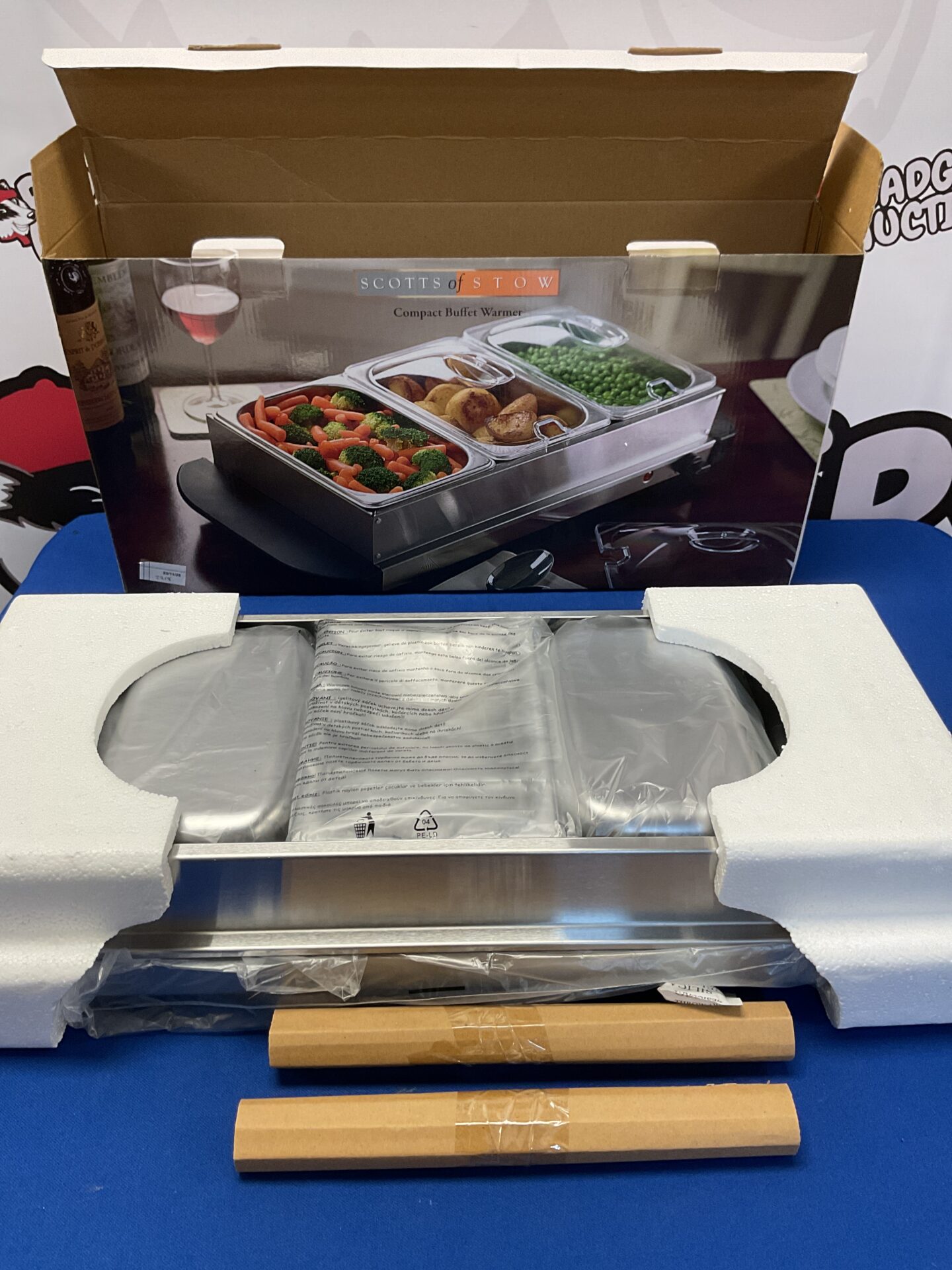 This is a Scotts of Stow compact buffet warmer, designed for keeping food at serving temperature. Constructed with a stainless steel warming tray and a durable plastic casing, this warmer is intended for portable use, making it suitable for gatherings, parties, or catering events. The design allows for easy transport and setup, providing a convenient solution for maintaining food warmth during serving.