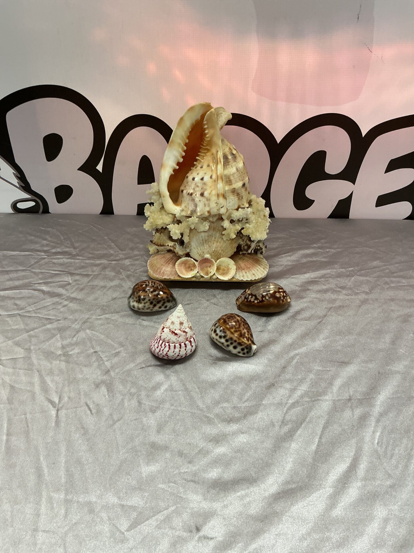 This is a unique sculpture crafted entirely from various sea shells. The shells are meticulously arranged and adhered to create a three-dimensional form, evoking a sense of the ocean and coastal life. The sculpture showcases a variety of shell types, sizes, and textures, resulting in a visually interesting and tactile piece of art.
