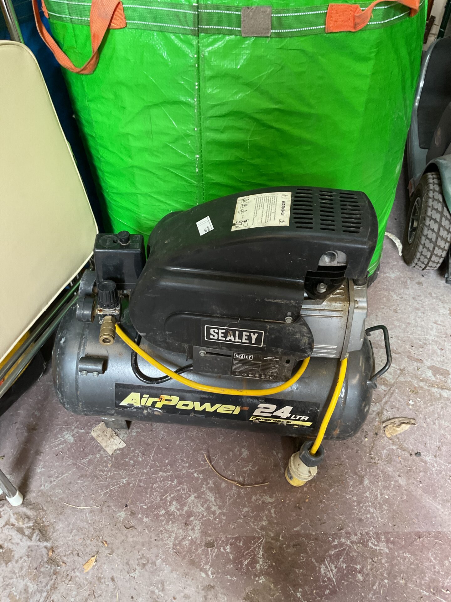 This is a Sealey air compressor with a 24-litre tank. It’s a robust and reliable unit, ideal for a variety of tasks around the garage, workshop, or home. This compressor is designed for powering air tools such as nail guns, spray guns, and tyre inflators, offering a versatile solution for DIY enthusiasts and professionals alike.