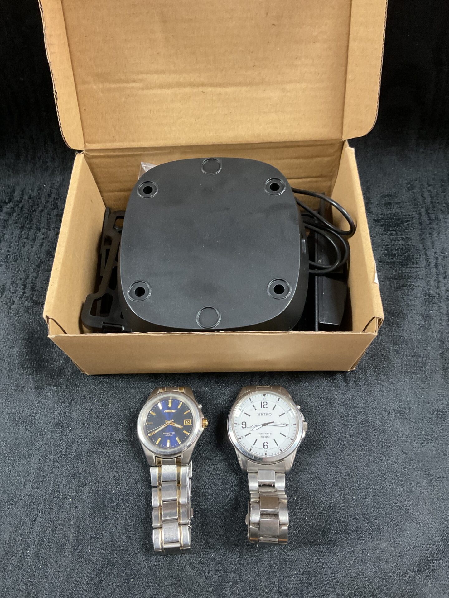 This lot includes two Seiko Kinetic wristwatches, offering the convenience of movement-powered technology and quartz accuracy. A watch winder is also included to keep the kinetic watches charged when not in use. Ideal for collectors or those seeking reliable, stylish timepieces.
