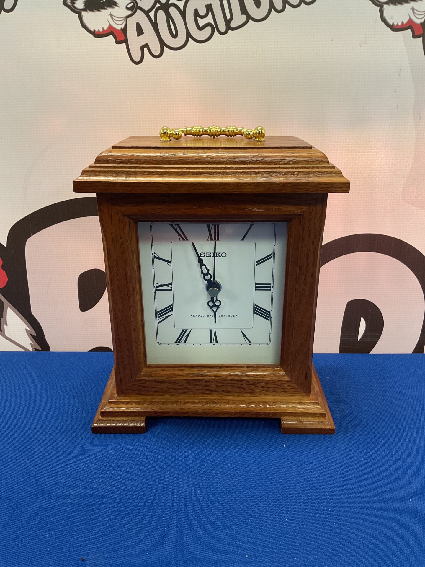 This is a Seiko radio wave control mantle clock, designed for accurate timekeeping through radio signal reception. The clock features a classic design, suitable for display on a mantlepiece, desk, or shelf. Its construction showcases Seiko’s commitment to quality and precision engineering, offering a blend of functionality and aesthetic appeal.