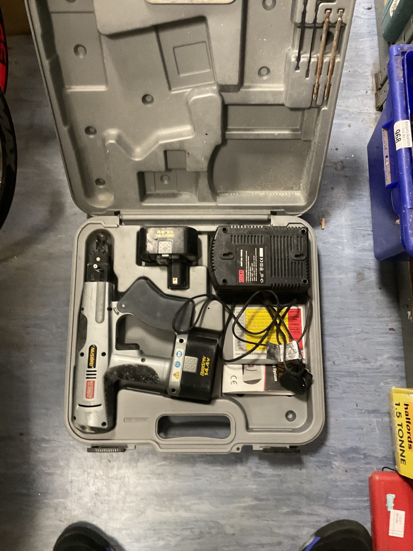 This lot features a Senco Duraspin screwing system, presented in its original carry case. The system appears to be a cordless screwdriver designed for efficient screw driving. The case contains the tool itself, along with a battery and charger, suggesting a complete, self-contained unit for various DIY and professional applications.