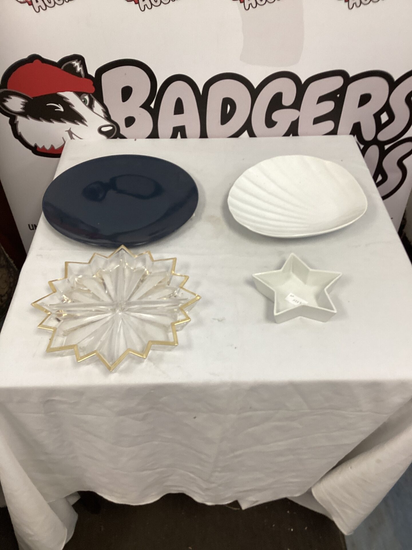 This lot comprises a collection of ceramic serving dishes and plates, ideal for presenting food with a touch of elegance. The set includes two serving dishes, one featuring a detailed floral pattern and the other a simple, classic design. Alongside these are two plates, complementing the serving dishes and completing the set for a coordinated table presentation.