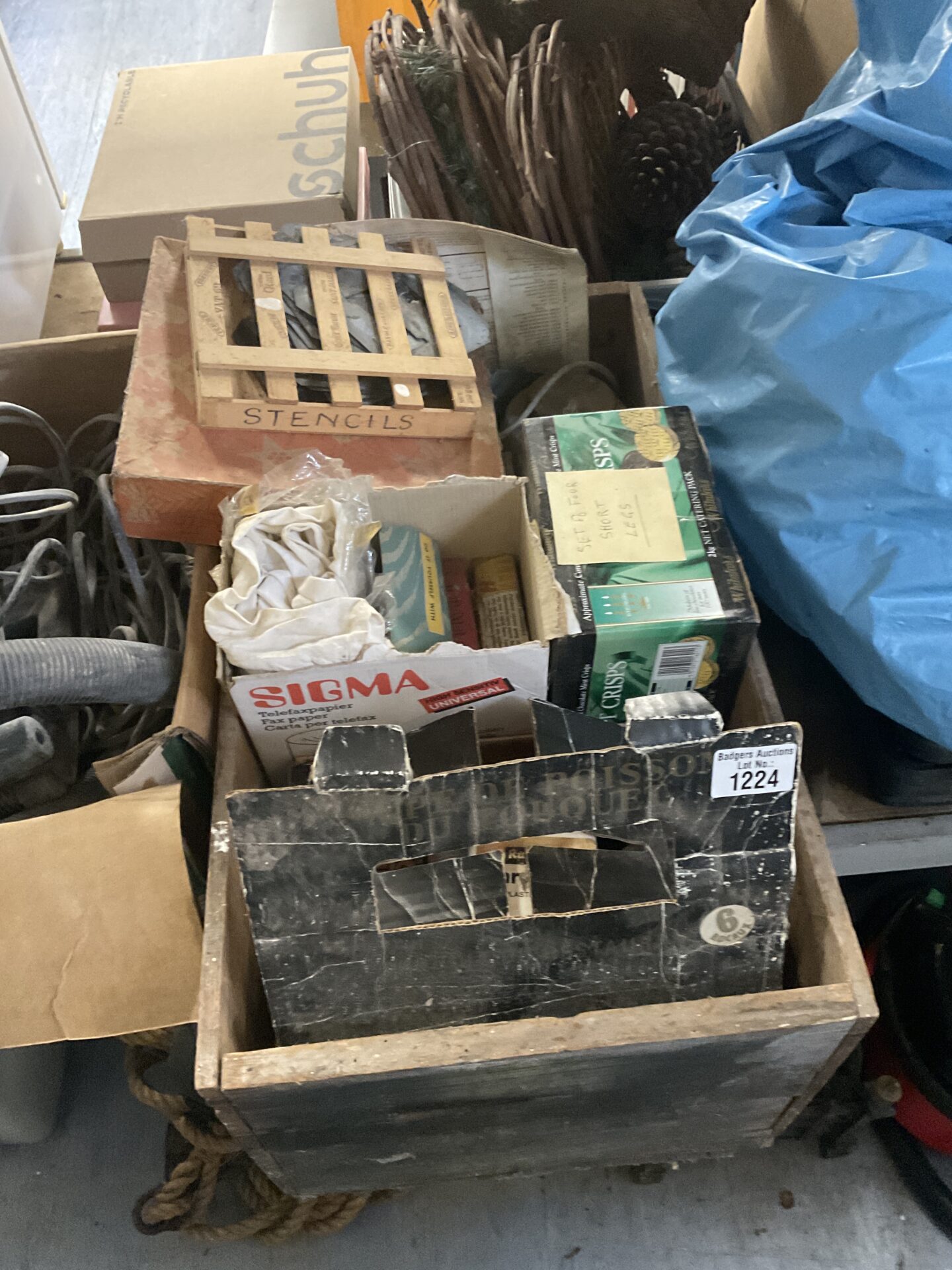 This lot comprises a collection of items recovered during a shed clearance. It includes a box containing various stencils, alongside other assorted garden and DIY hardware. The contents appear to be a mix of tools and materials accumulated over time, suitable for a variety of projects.