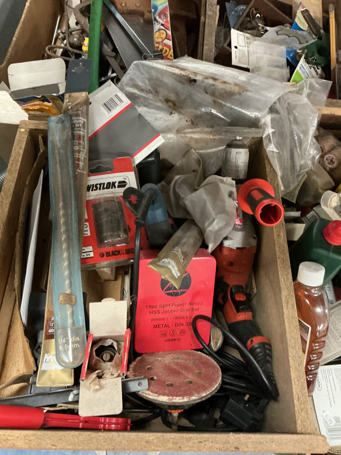 This shed clearance lot includes a drill and a selection of drill bits, along with various other tools and fixings. The items show signs of use and are offered as a clearance lot, functionality not guaranteed. Ideal for DIY enthusiasts or those seeking parts for repair projects.