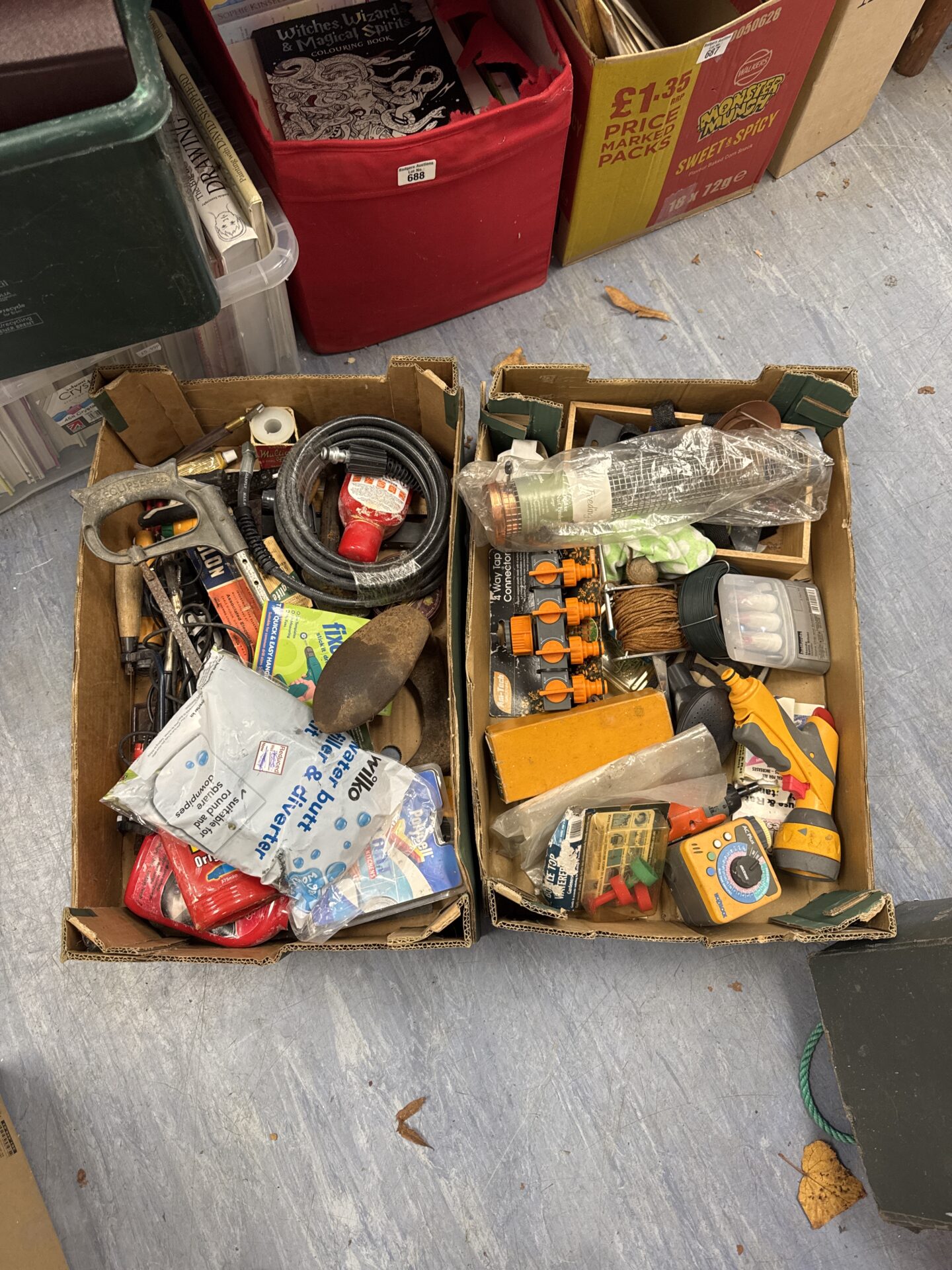 This lot comprises a collection of items typically found in a garden shed or workshop. It includes various hand tools, hardware, and miscellaneous items, offering a diverse range for DIY enthusiasts or those needing to replenish their tool collection. The lot appears to contain a mix of older and newer items, suggesting a build-up over time.