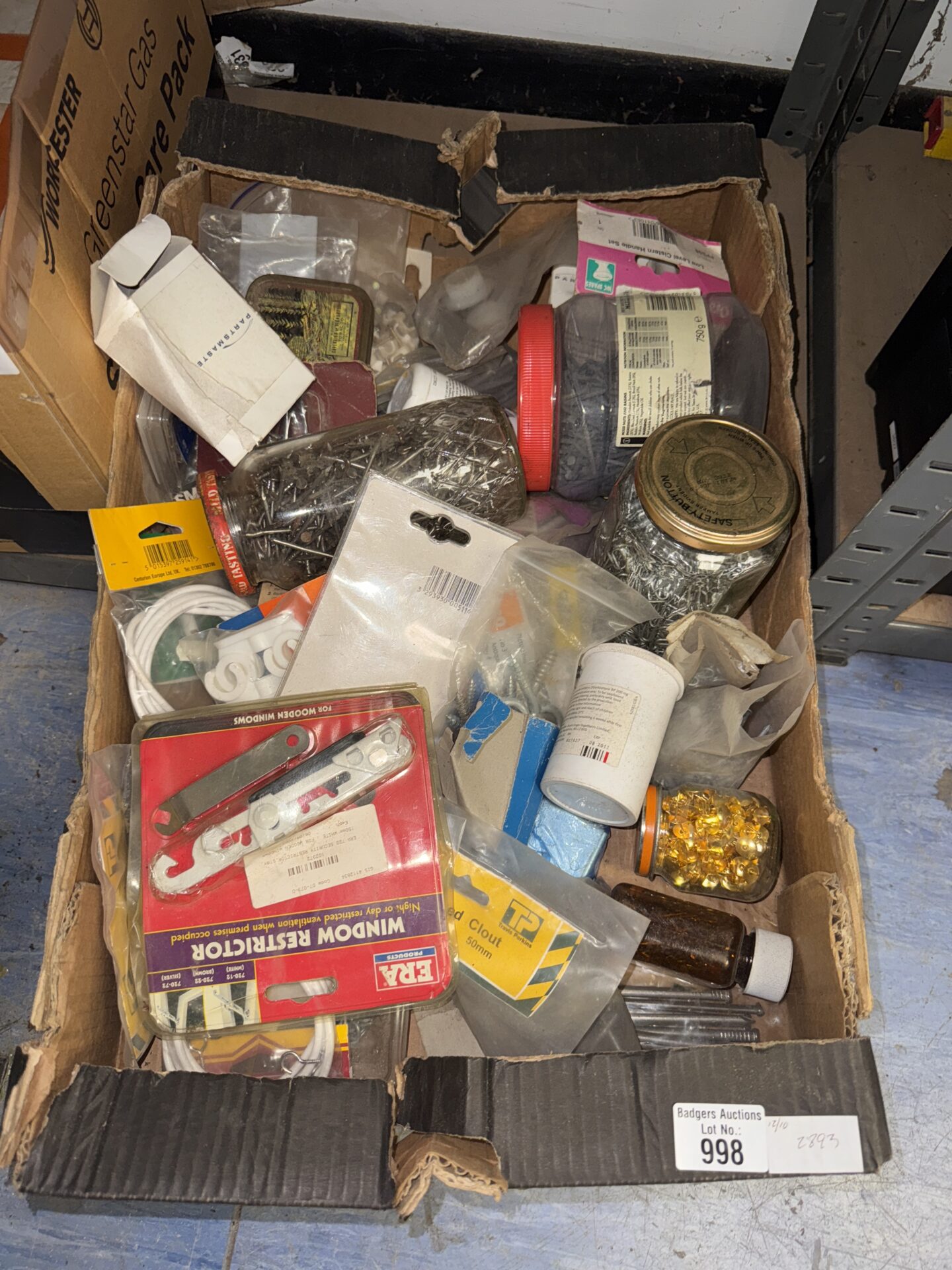 This lot comprises a collection of various fixings and small hardware items, typical of a shed or workshop clearance. It includes nails, tacks, screws, and other small metal components, useful for a range of DIY and repair tasks. The lot appears to be a mixed assortment accumulated over time, offering a versatile selection for general maintenance and projects.