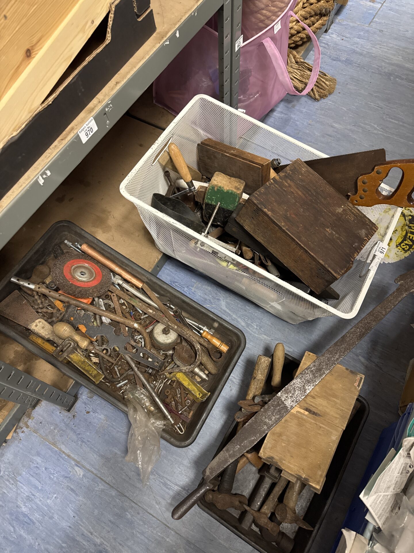 This lot comprises a collection of various hand tools, likely from a shed clearance. The tools appear to be a mix of gardening, workshop, and general-purpose implements. There is a diverse range of items, including wrenches, screwdrivers, pliers, hammers, and potentially some specialized tools for specific tasks.