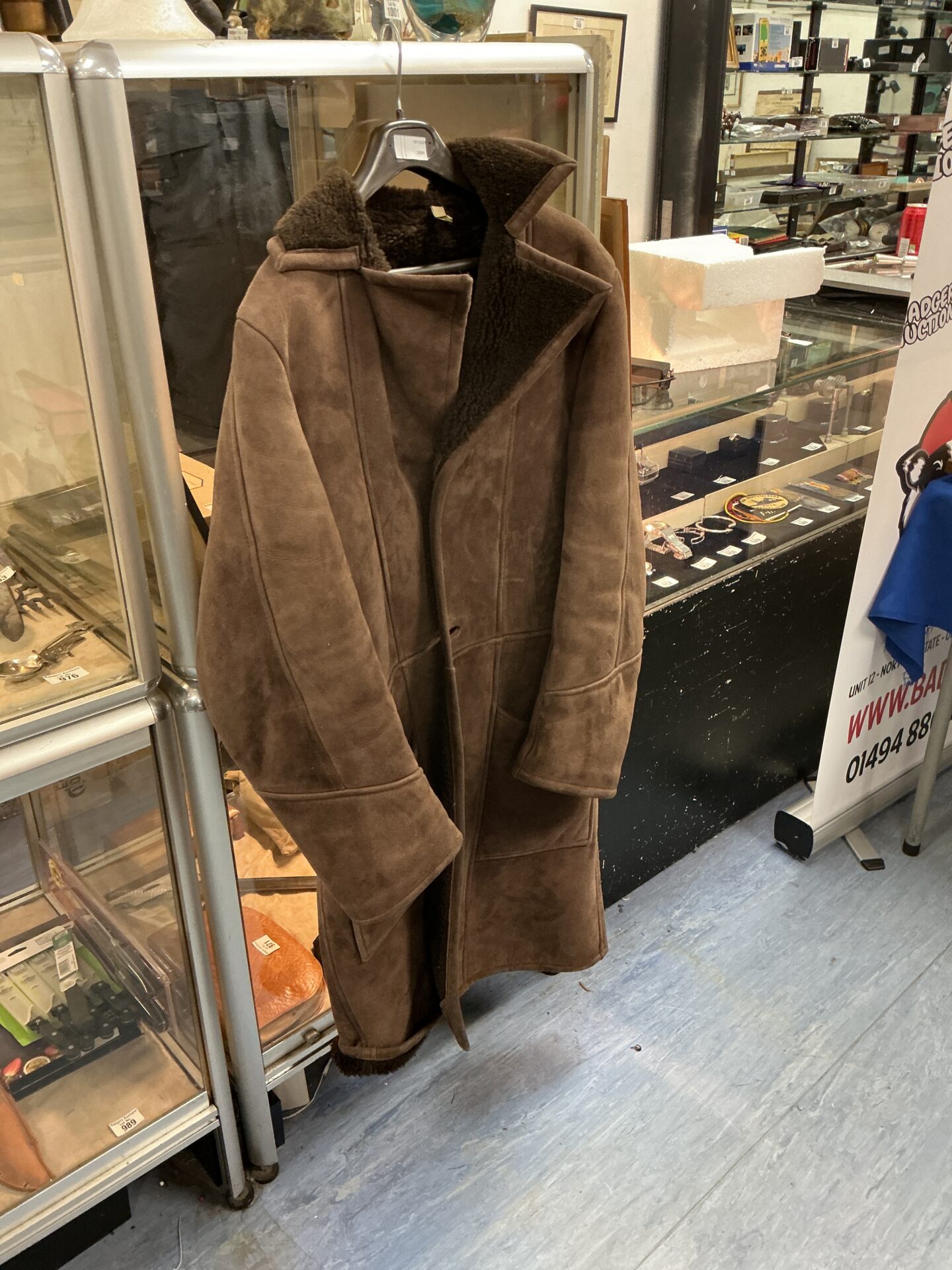 This is a full-length sheepskin coat, featuring a warm and luxurious sheepskin exterior with a leather trim. The coat offers substantial warmth for colder weather and has a classic, timeless style. The substantial weight and quality of the sheepskin suggest a well-made and durable garment.