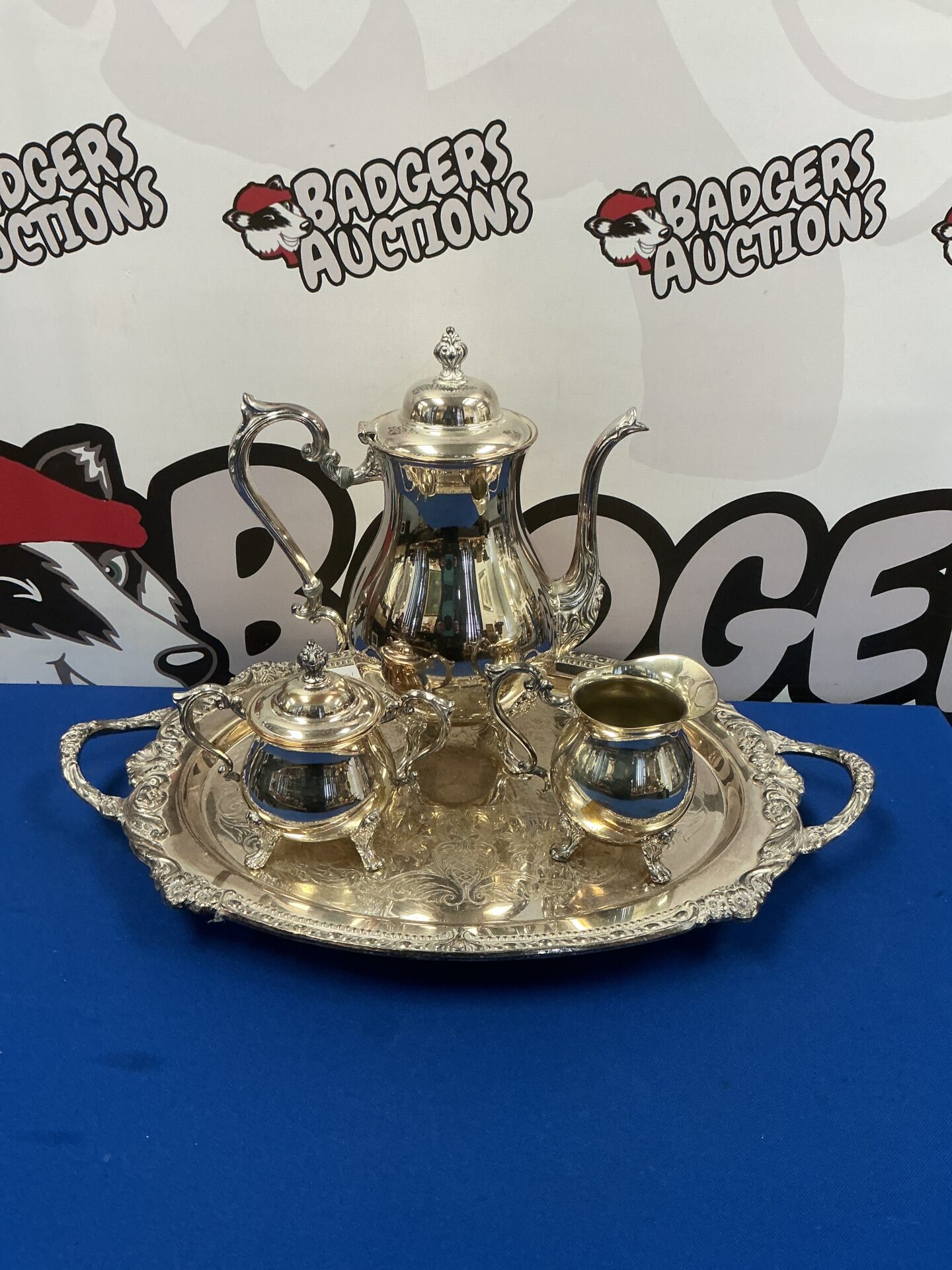 This elegant coffee set by Sheridan comprises a coffee pot, tray, sugar bowl, and milk jug, all crafted from silver plate. The set exhibits a classic design, likely dating from the mid-20th century, with graceful curves and a polished finish. The tray provides a refined base for serving, while the coffee pot, sugar bowl, and jug complement each other to create a cohesive and sophisticated tea or coffee service.
