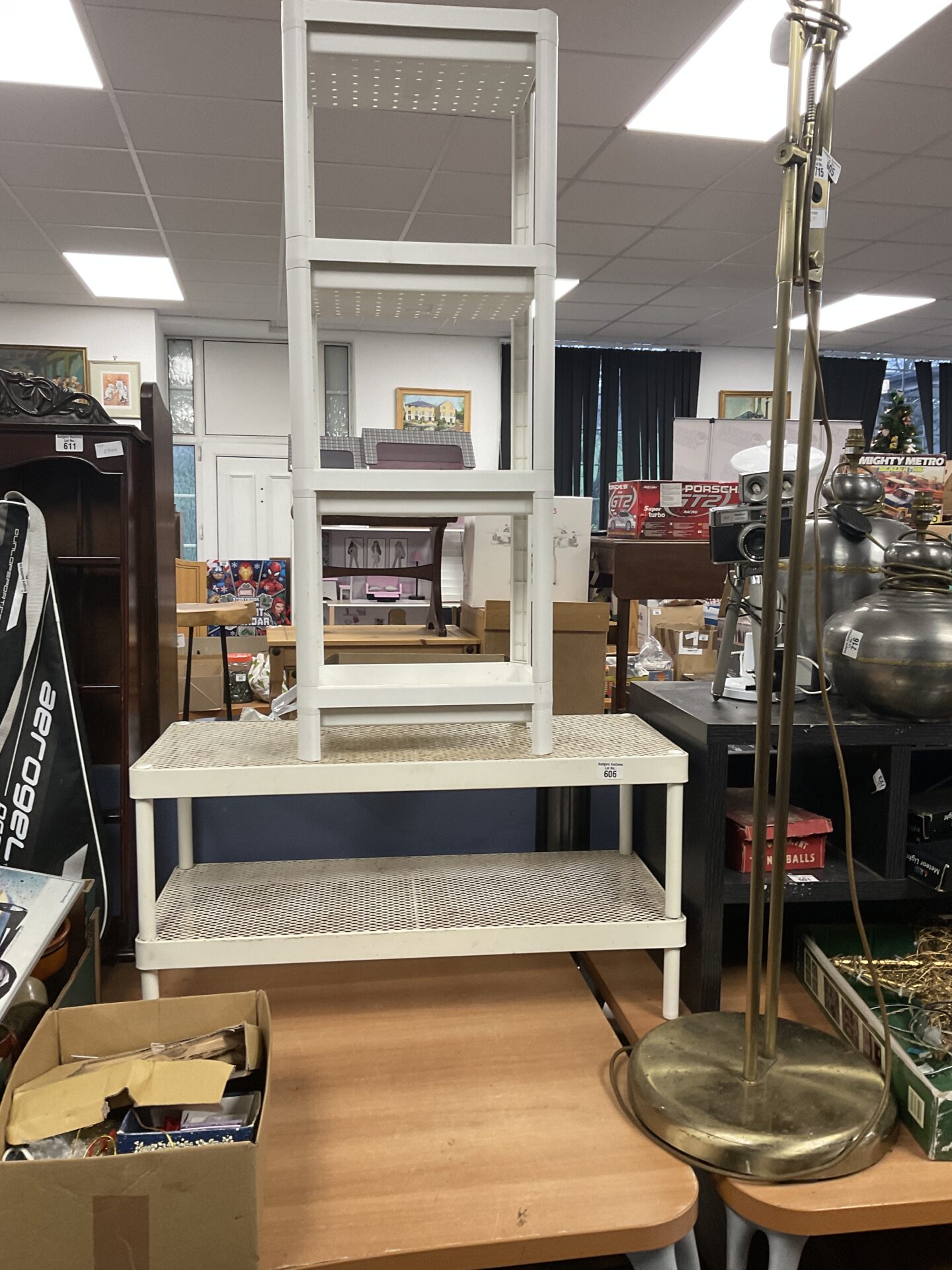 This shelf unit shows signs of previous use and may benefit from cleaning. It appears structurally sound, but a thorough inspection is recommended before use. This unit could appeal to collectors of vintage storage solutions or those seeking a practical and affordable storage option for smaller spaces.