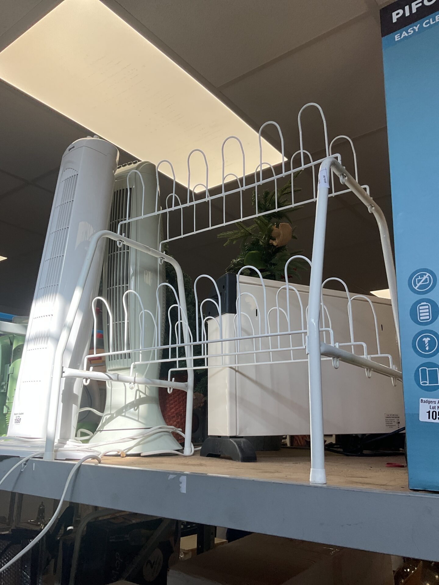 This is a wire-frame shoe rack designed to provide convenient storage for footwear. Constructed from metal, it features multiple tiers to accommodate several pairs of shoes, making it ideal for hallways, bedrooms, or closets. The open design allows for ventilation, helping to keep shoes fresh and organised.