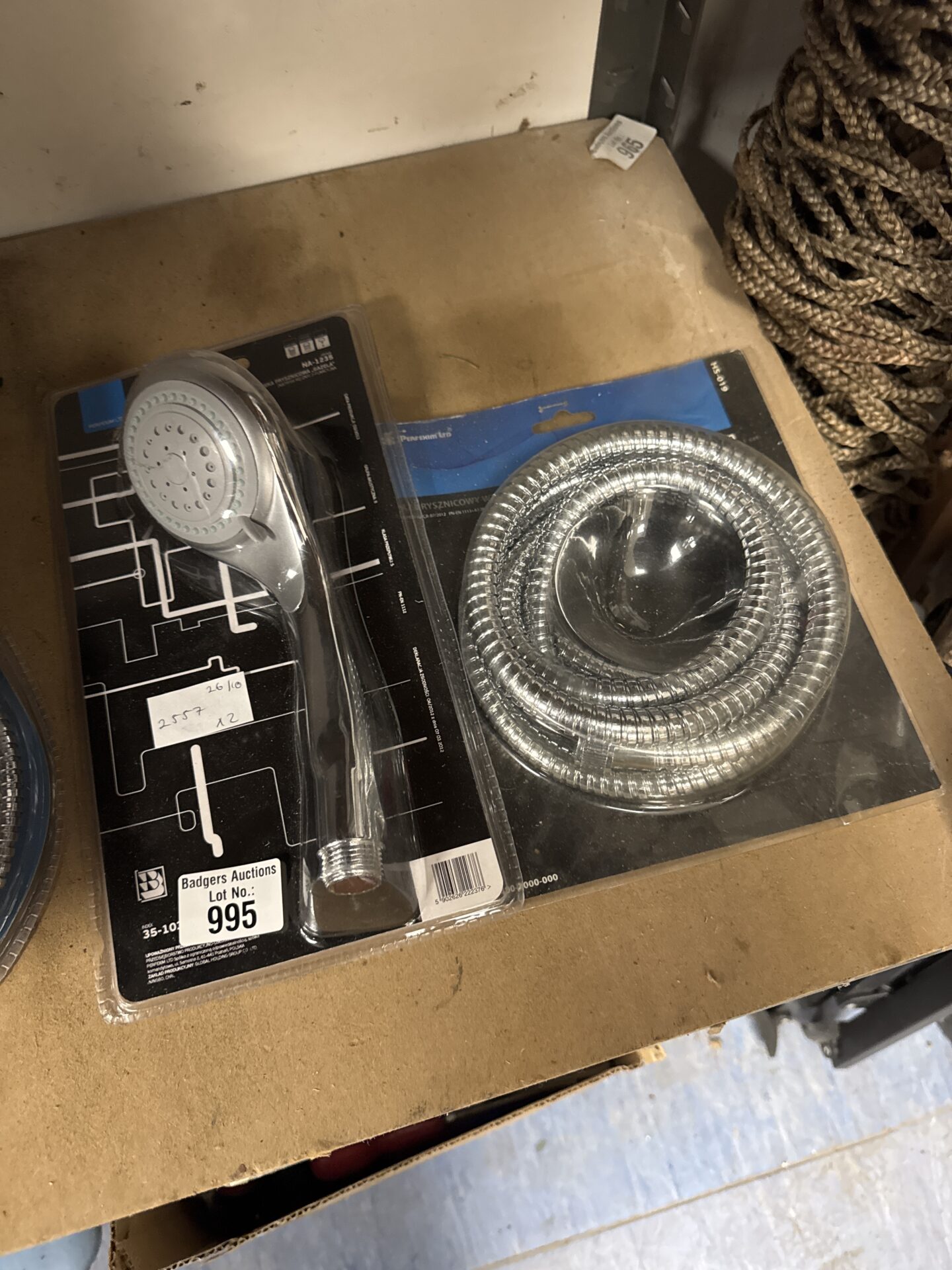 This lot features a new shower head and hose set, presented in its original packaging. The set appears to be constructed from chrome-plated metal, offering a sleek and modern aesthetic suitable for various bathroom styles. It is designed for easy installation and provides a convenient upgrade to existing shower systems.