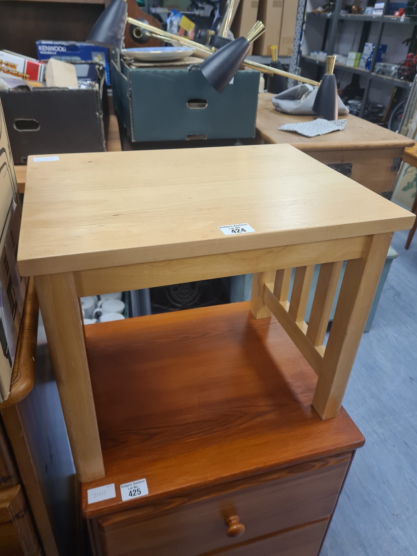This is a small side table, finished in a light, beach-effect woodgrain. Its simple construction features four legs supporting a square tabletop. This table would suit a variety of interior styles, particularly those with a coastal or relaxed aesthetic.