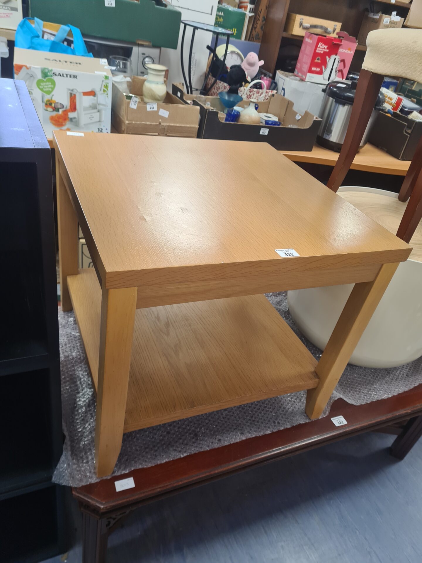 This is a small side table, finished with a light-toned wood effect, designed to evoke a beach aesthetic. Its simple, clean lines and compact size make it versatile for use as a bedside table, living room accent piece, or in smaller spaces. The table features a single shelf beneath the tabletop, providing additional storage or display space.