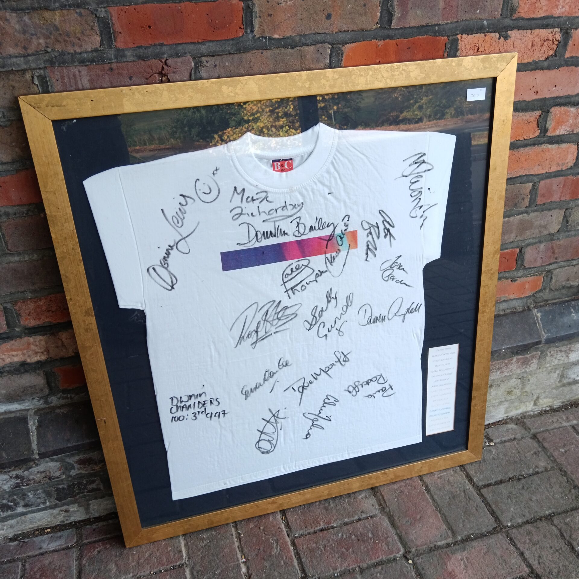This is a framed t-shirt bearing multiple signatures from athletes, including notable names like Denise Richards and Dean Macey. The t-shirt is presented within a protective frame, intended for display. The signatures appear to be in permanent marker, directly on the fabric of the t-shirt.