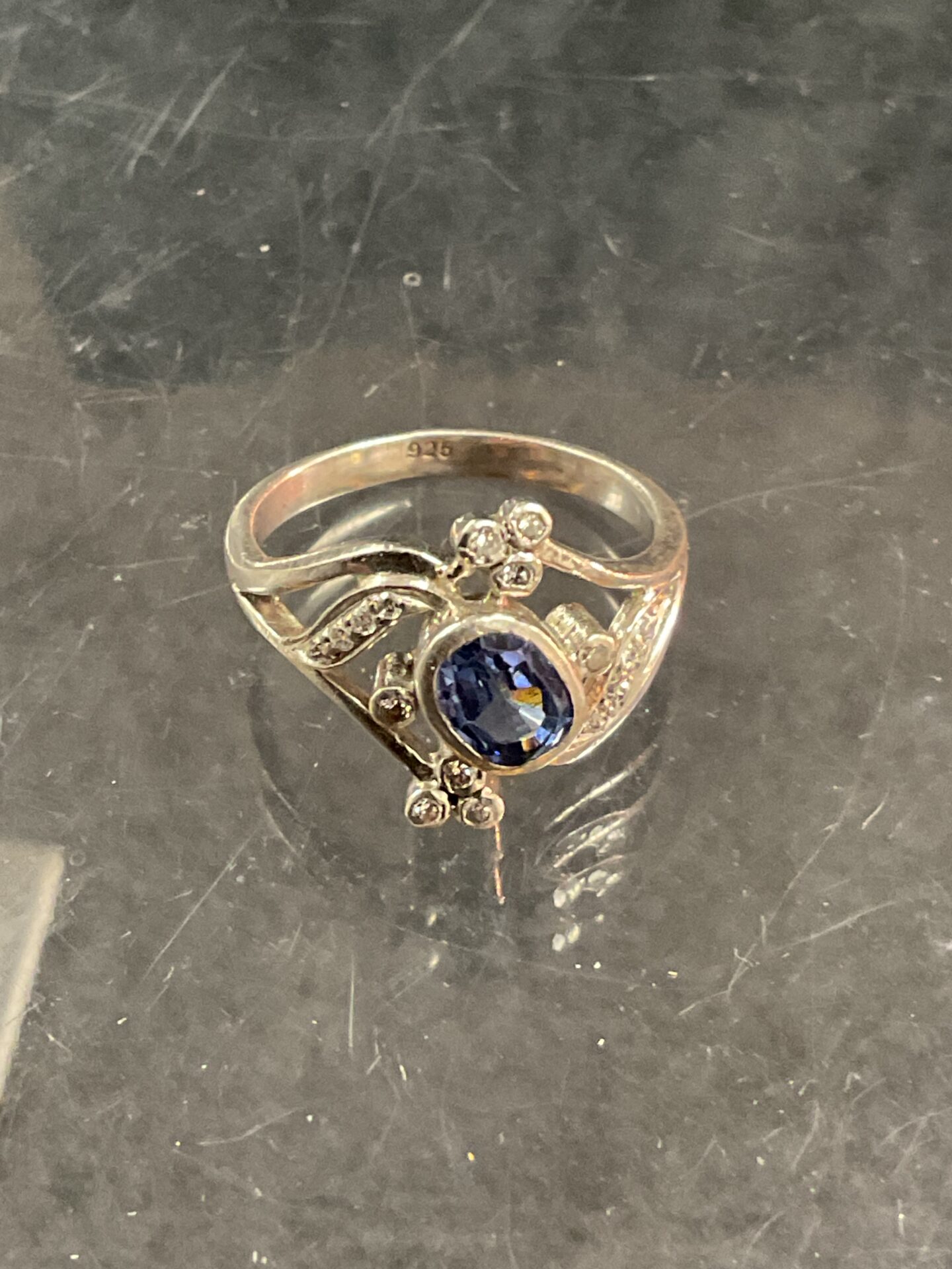 This elegant dress ring is crafted from 925 sterling silver, featuring a captivating oval-cut blue gemstone as its focal point. The gemstone is securely held within a claw setting, surrounded by delicate silver detailing that adds to the ring’s overall sophistication. The band is designed with a flowing, organic shape, enhancing the ring’s graceful aesthetic and making it a perfect statement piece for any occasion.