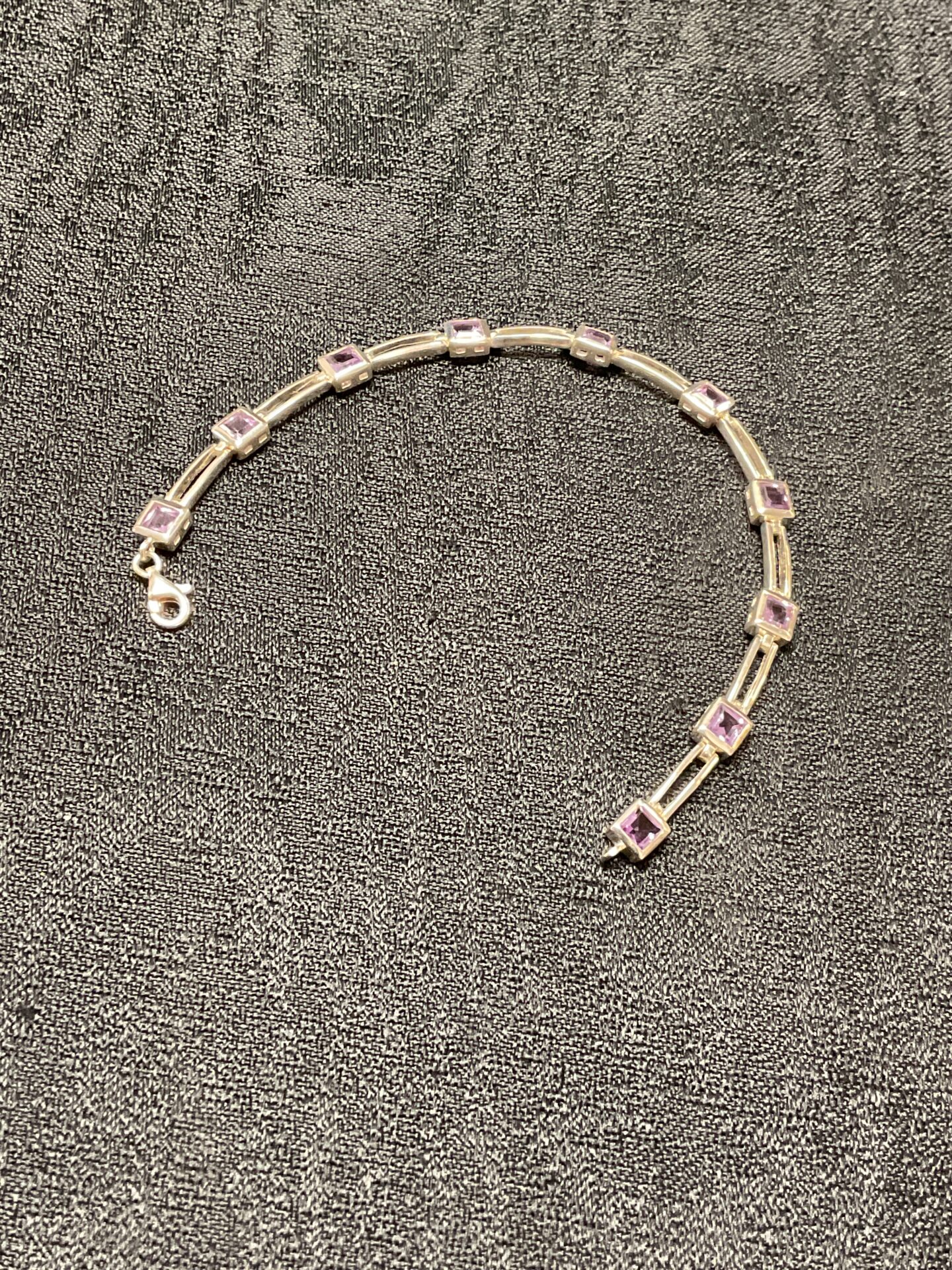 This bracelet features a series of amethyst gemstones set in a 925 silver frame. The design is a classic style, suitable for everyday wear or special occasions. The amethyst stones exhibit a lovely purple hue, adding a touch of elegance to the piece. The bracelet is secured with a clasp, allowing for easy wear and removal.