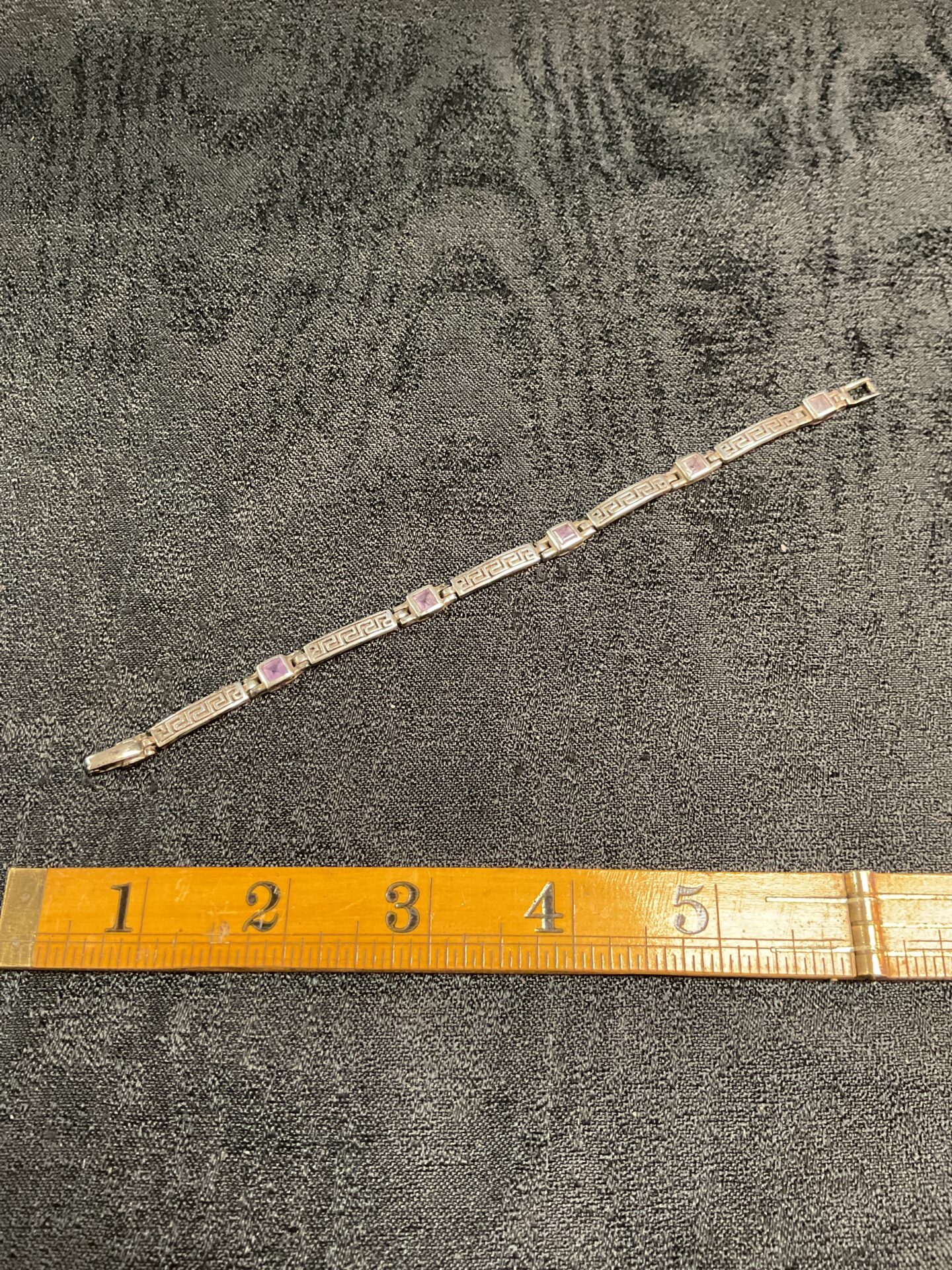 This elegant bracelet features a series of interconnected links crafted from 925 sterling silver. Each link showcases a vibrant amethyst gemstone, adding a touch of colour and sophistication. The design is classic and versatile, suitable for both everyday wear and special occasions. The secure clasp ensures a comfortable and secure fit.