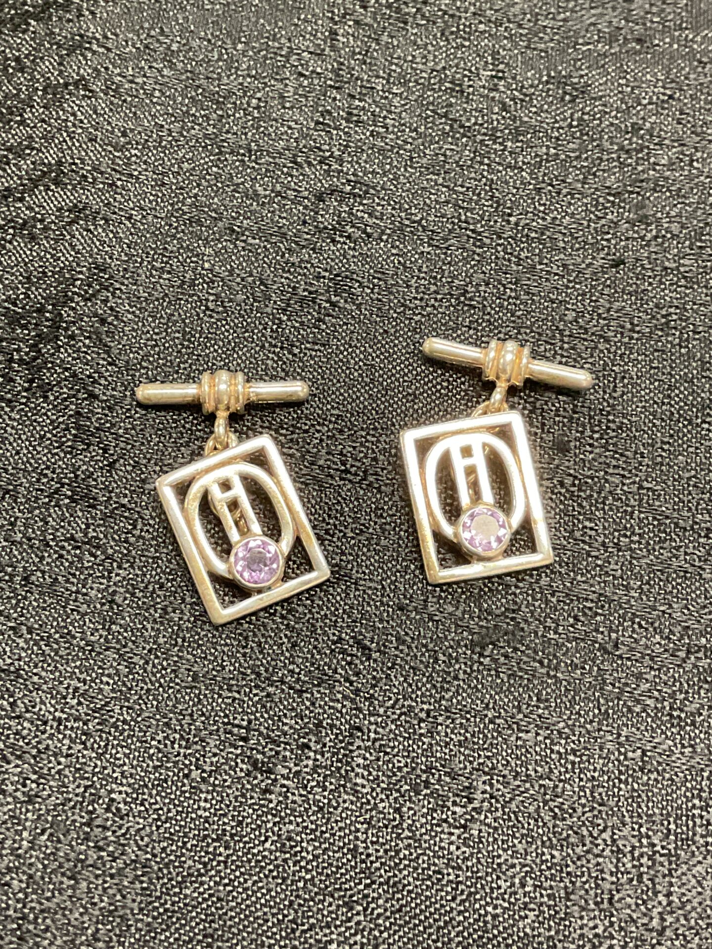 These elegant cufflinks are crafted from 925 silver, featuring striking amethyst stones set within a geometric design. The cufflinks exhibit a classic art deco aesthetic, suggesting a mid-century origin. The silver has a polished finish, enhancing the purple hue of the amethyst and creating a sophisticated look suitable for formal occasions or adding a touch of refinement to everyday wear.