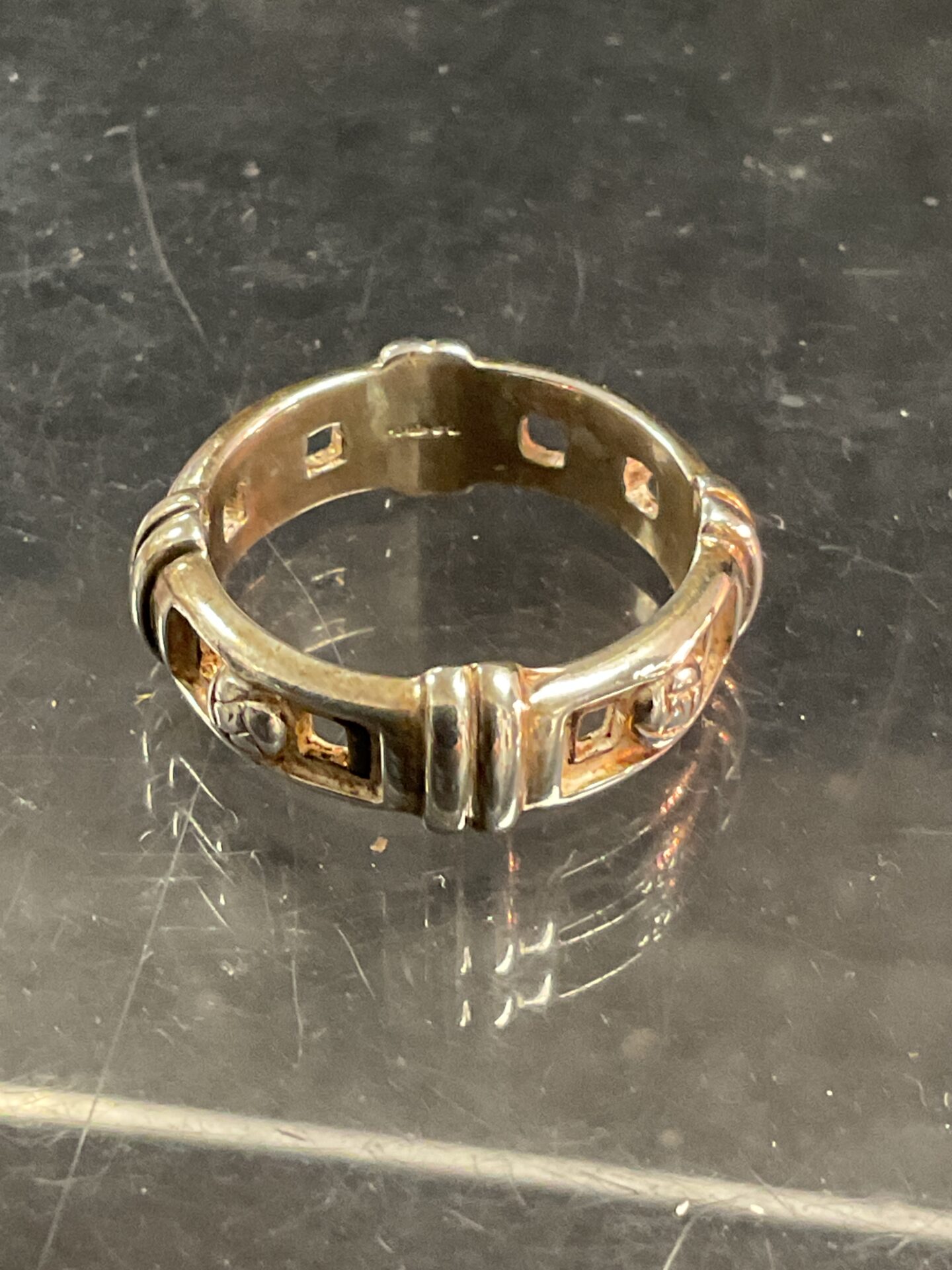 This striking ring is crafted from 925 silver and designed to resemble a miniature belt buckle. The ring features detailed embossed detailing, evoking a Western or cowboy aesthetic. Weighing 6.2g, this ring is a bold statement piece, suitable for those who appreciate unique and eye-catching jewellery.