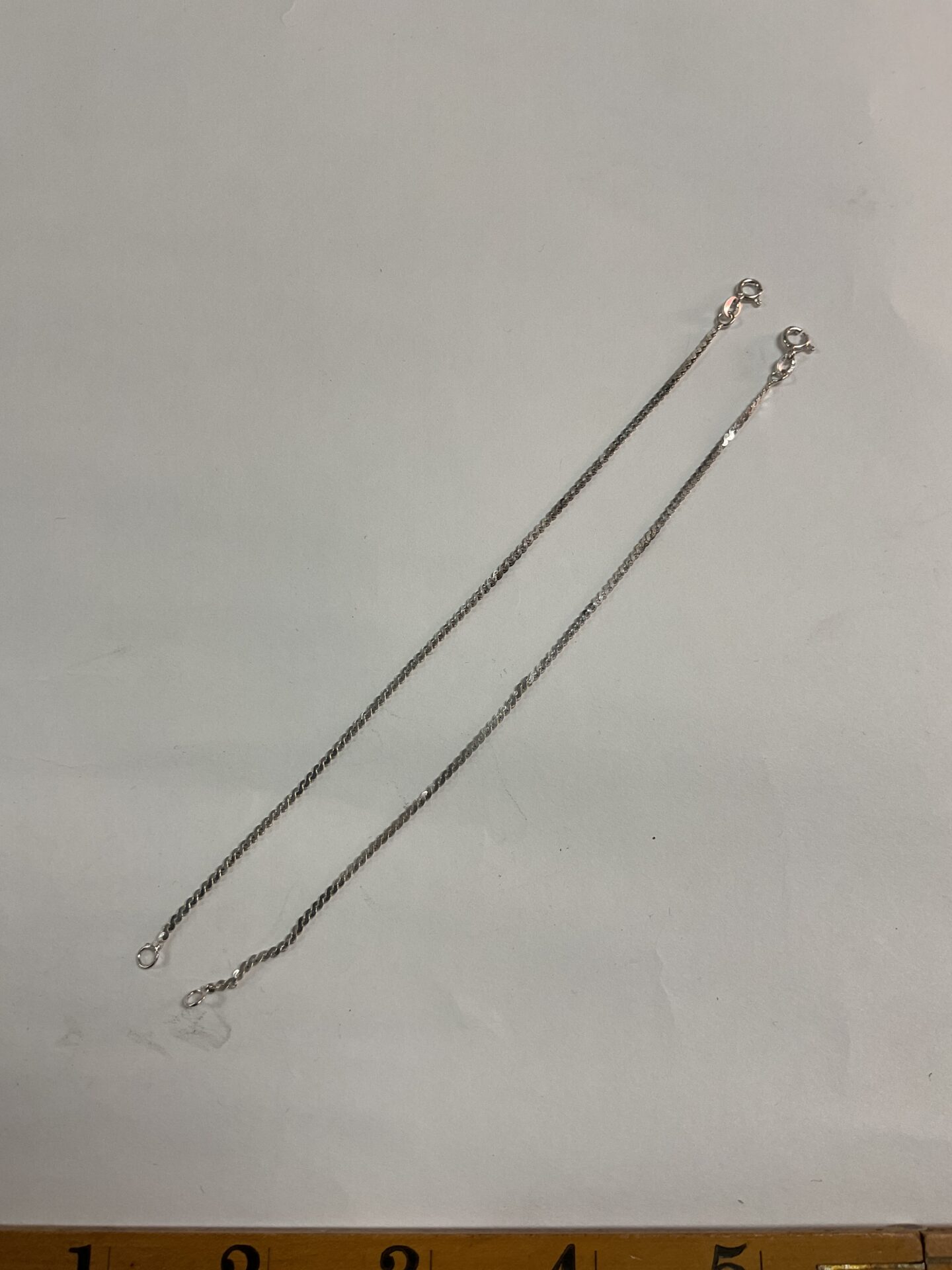 This lot comprises a pair of delicate silver chain bracelets, crafted from 925 sterling silver. Each bracelet features a classic, interwoven link design, offering a subtle shimmer and comfortable wear. The design is versatile, suitable for everyday wear or as a complement to more formal attire.