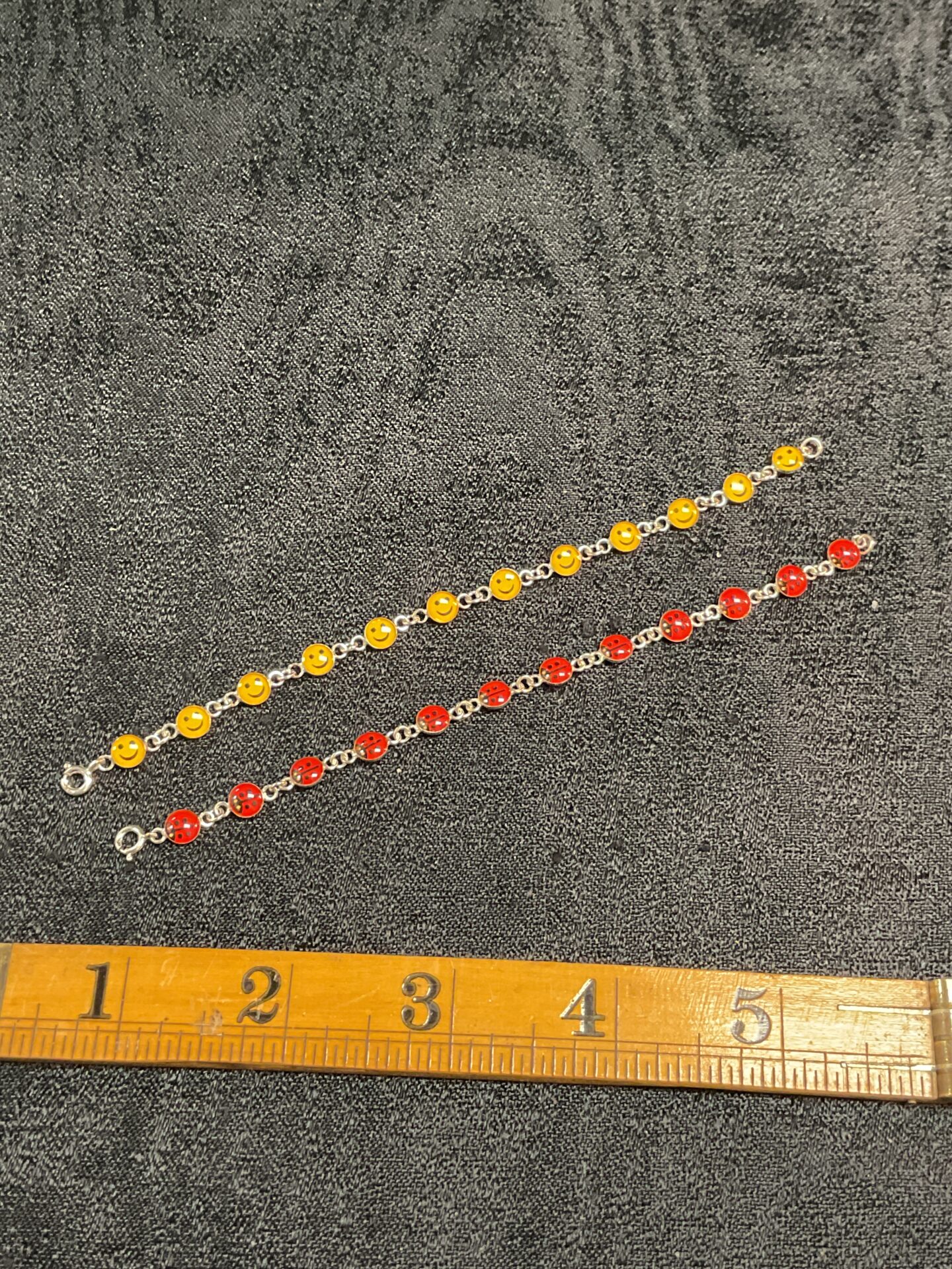 These delightful bracelets are crafted from 925 silver, featuring charming designs intended for young wearers. One bracelet showcases a cheerful smiley face motif, while the other is adorned with a playful ladybird. These bracelets are designed to add a touch of whimsy to any child’s outfit and are suitable for everyday wear or special occasions.