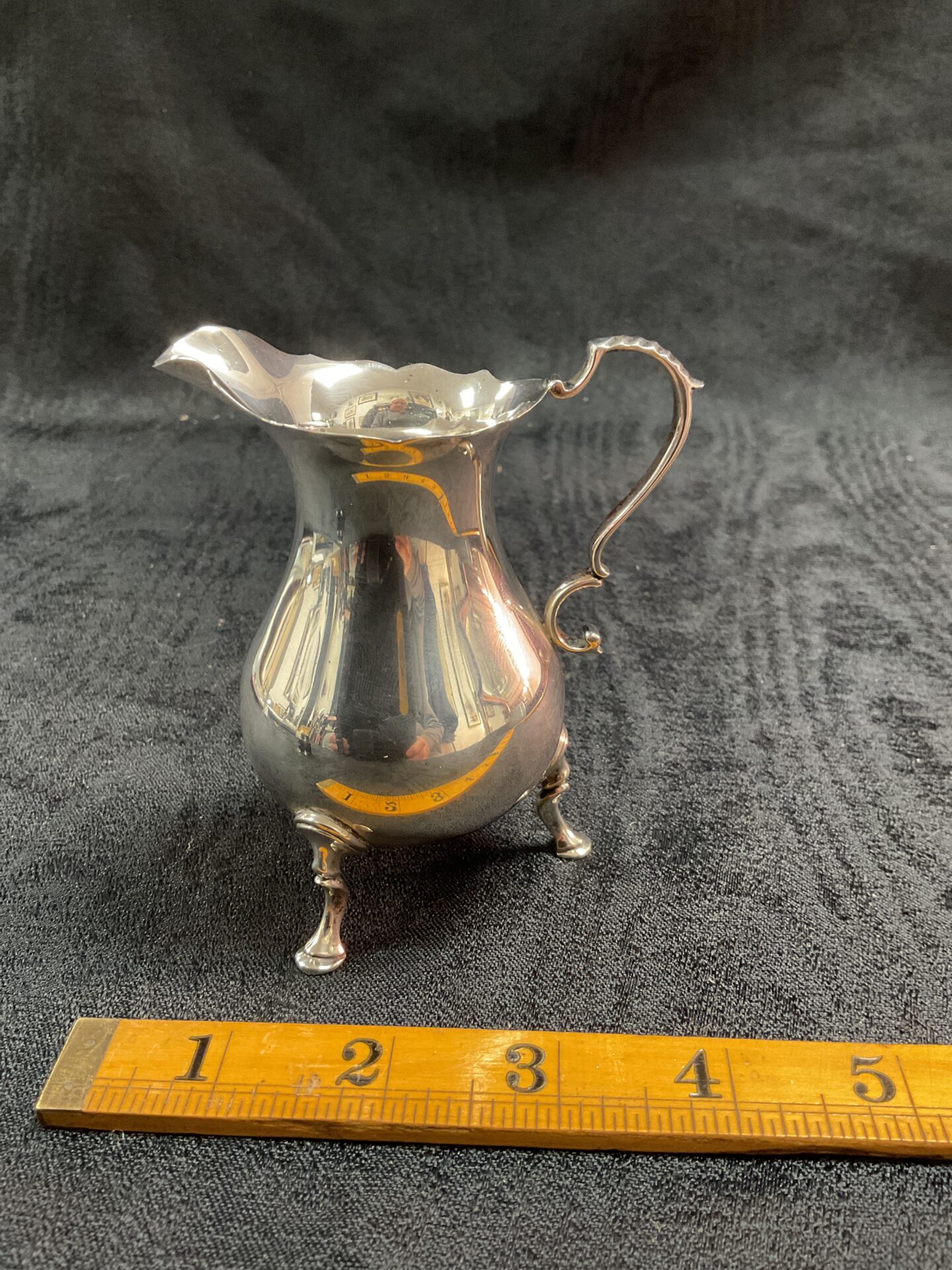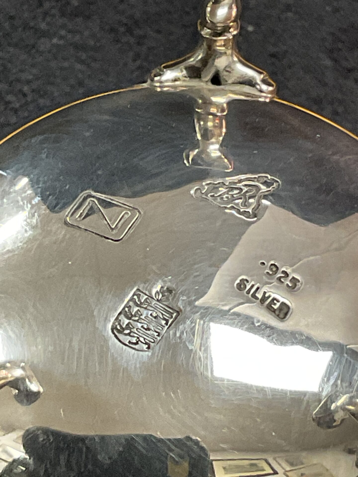This elegant cream jug is crafted from hallmarked 925 silver, showcasing a classic, slightly tapered form. The jug stands on three ornate, shaped feet, adding to its refined aesthetic. The handle is gracefully curved, providing a comfortable grip, and the spout is delicately formed for smooth pouring. Weighing 117.7g, this piece exemplifies traditional silver craftsmanship.