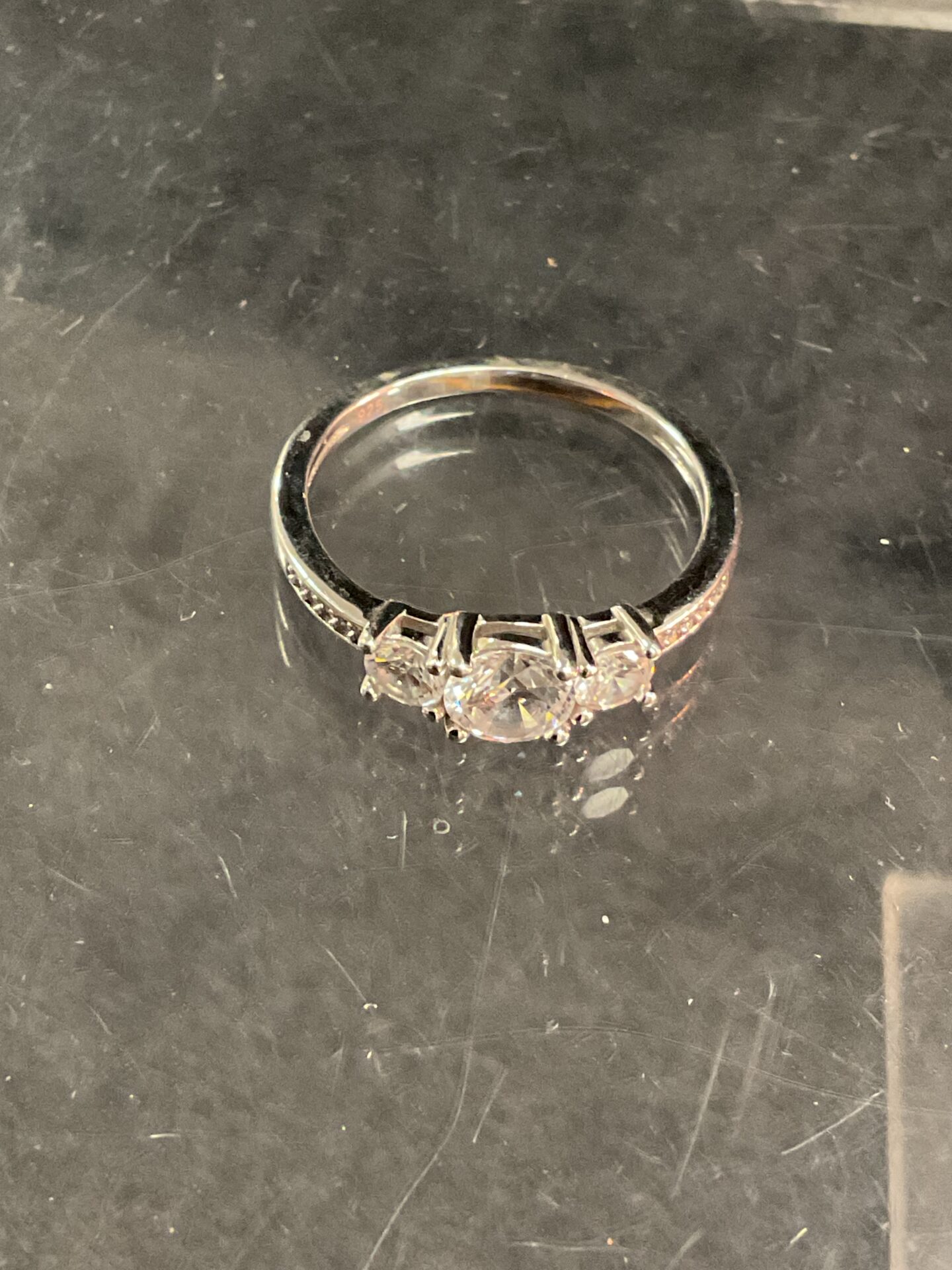 This elegant ring features a 925 silver band adorned with three sparkling cubic zirconia stones. A classic three-stone setting provides timeless appeal, and the ring is size T. Perfect for everyday wear or a special occasion, this ring offers affordable sparkle and style.
