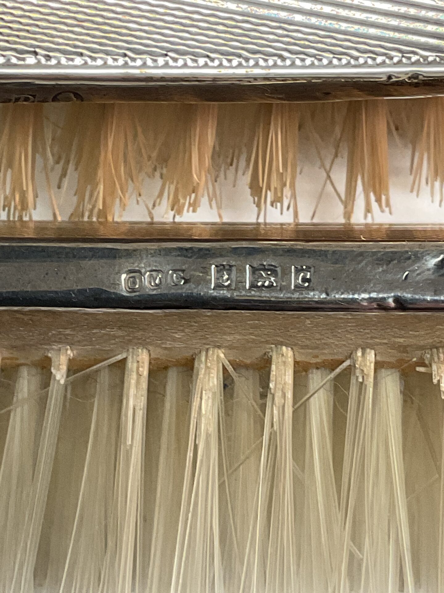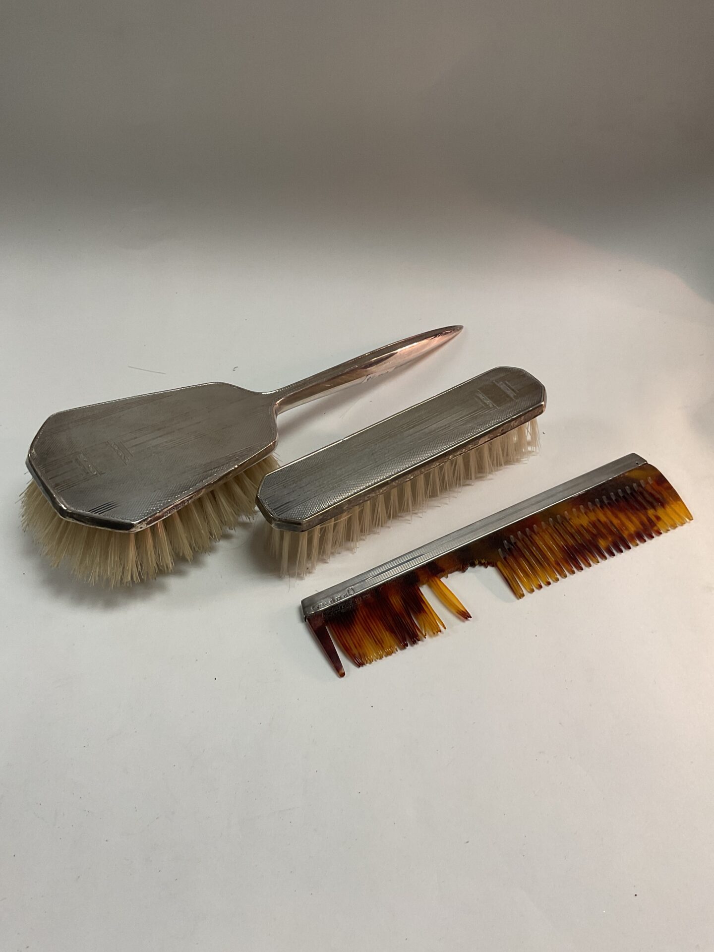 The brushes exhibit signs consistent with age and use, including some minor wear to the silver and bristles. Despite this, the set remains a charming example of vintage grooming accessories. Such sets are highly sought after by collectors of antique silver and those interested in Art Deco design. The presence of hallmarks adds to its desirability and potential value, making it a noteworthy addition to any collection or a unique decorative piece.