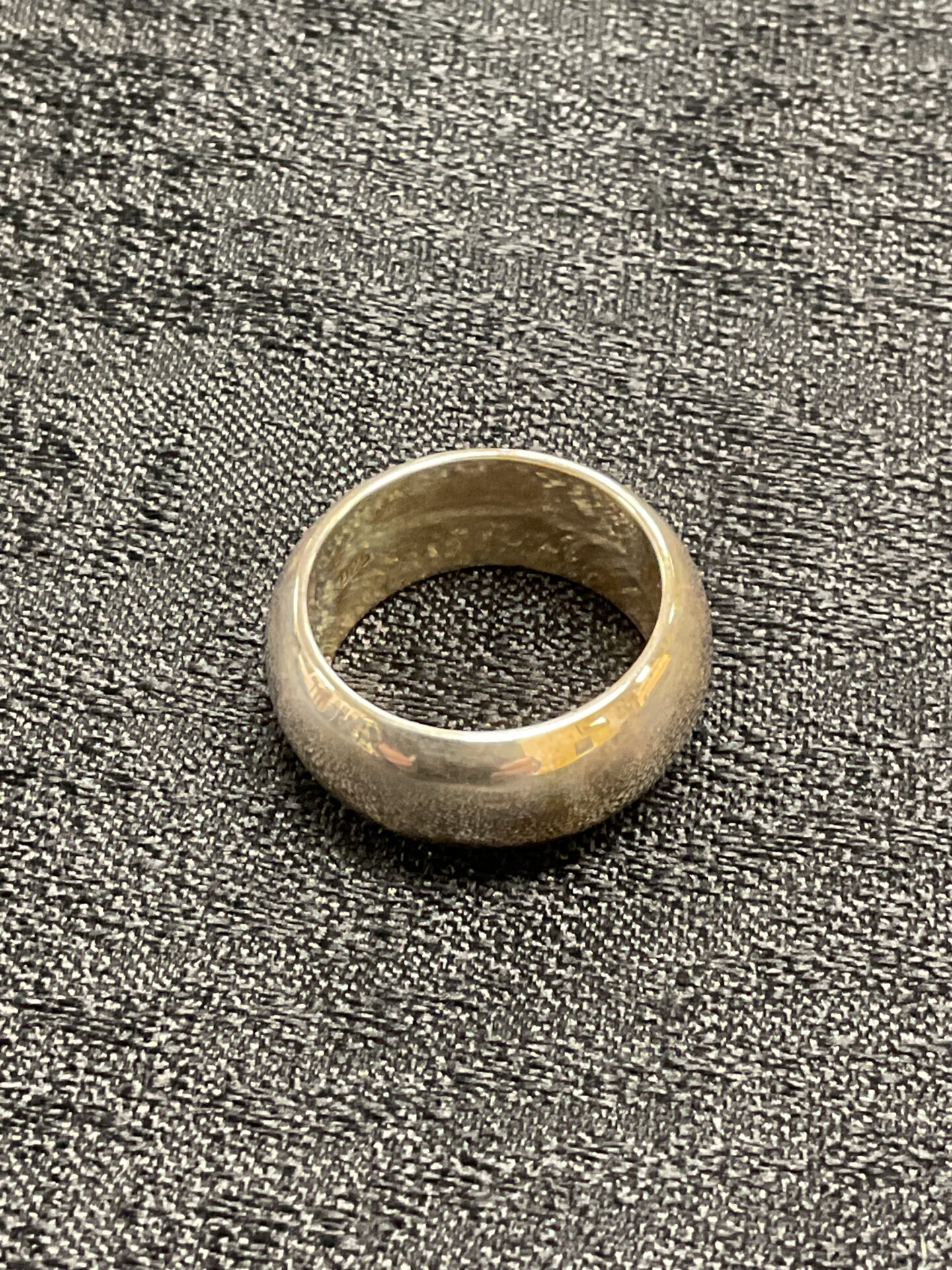 This is a substantial band ring crafted from 925 silver and finished with a gilt overlay. The ring presents a smooth, polished surface and a classic, minimalist design. Its substantial weight and wide band suggest a statement piece, suitable for everyday wear or special occasions. The ring is currently a size S.