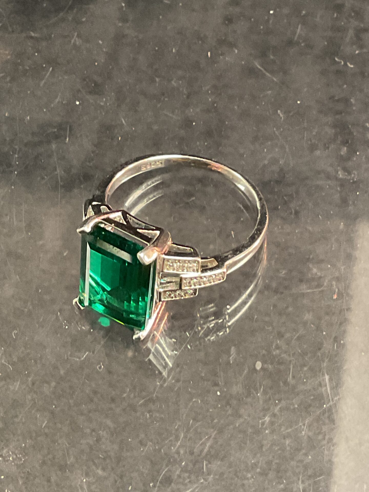 This striking ring features a vibrant green stone, likely a simulated emerald or peridot, set in a 925 sterling silver band. The stone is a substantial size and is presented in a square setting, adding a modern touch. The band is simple and elegant, allowing the stone to be the focal point. This ring is a bold statement piece, perfect for adding a pop of colour to any outfit.