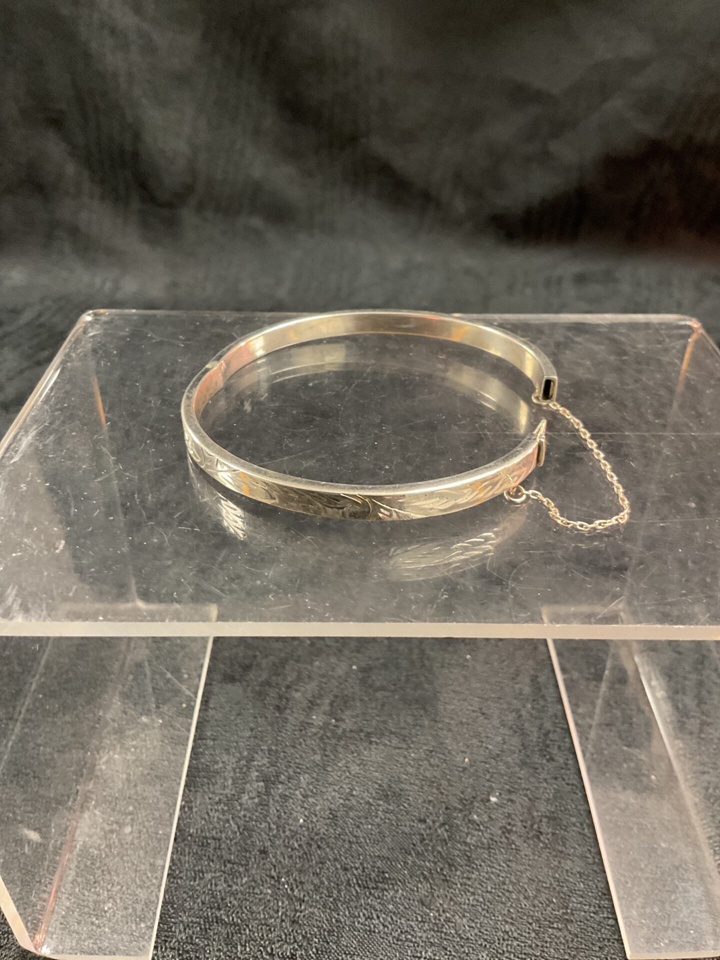 This is a beautifully crafted hinged bracelet, constructed from 925 sterling silver. The bracelet features an articulated design, allowing for comfortable wear and movement. The exterior is adorned with intricate decorative detailing, suggesting a vintage or antique origin. The hinged closure ensures easy application and removal.