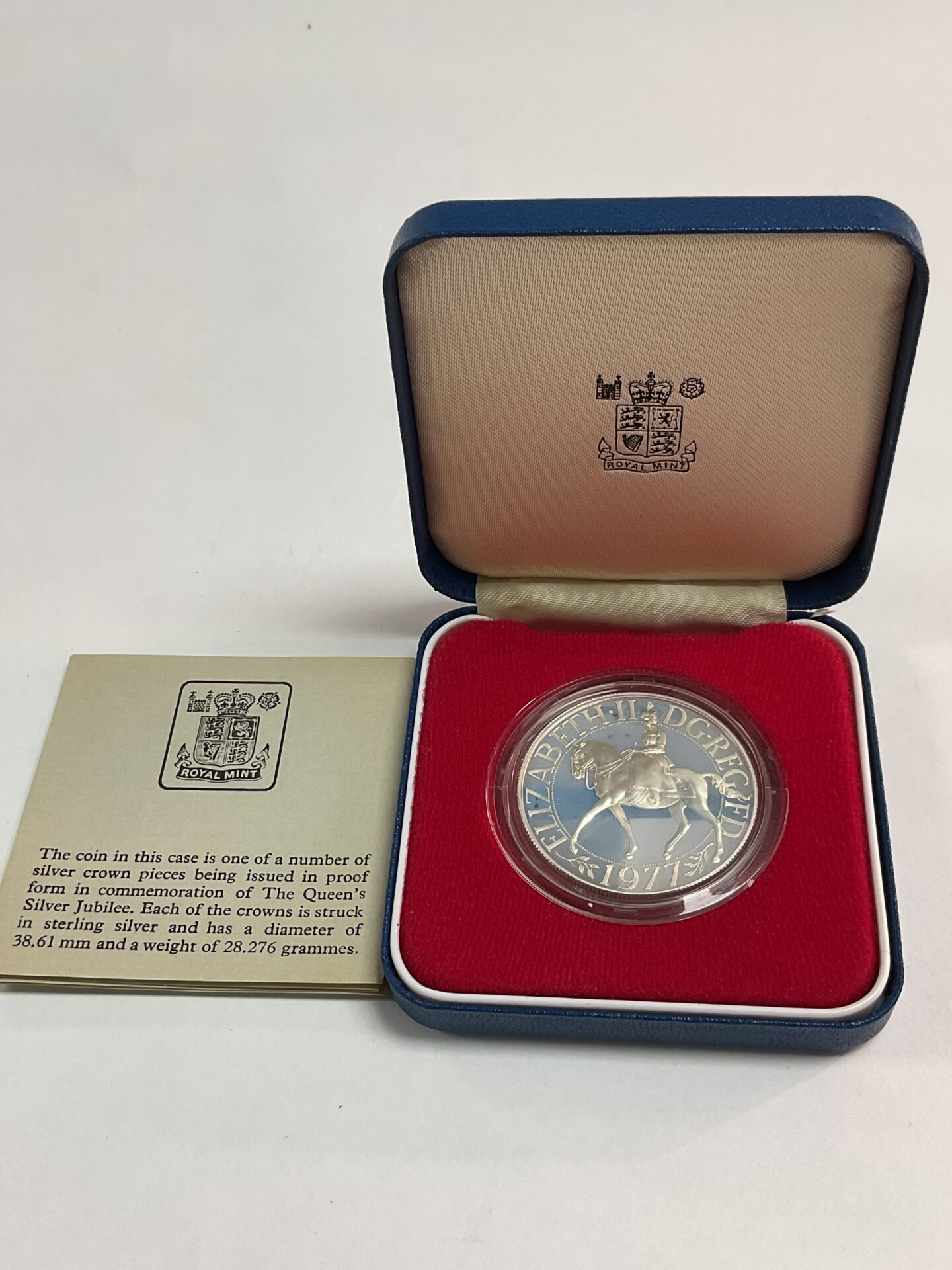 This sterling silver proof crown commemorates Queen Elizabeth II’s Silver Jubilee in 1977. The coin weighs 28.276g and has a diameter of 38.61mm. A beautiful addition to any collection of British coinage or royal memorabilia.