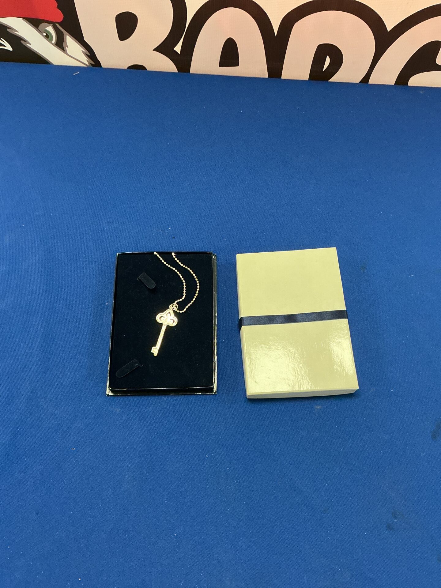 This elegant necklace features a delicate silver chain supporting a beautifully crafted key pendant. The pendant is crafted from 925 silver and adorned with sparkling jewelled accents, adding a touch of glamour to the piece. The design is both classic and contemporary, making it a versatile accessory for various occasions.