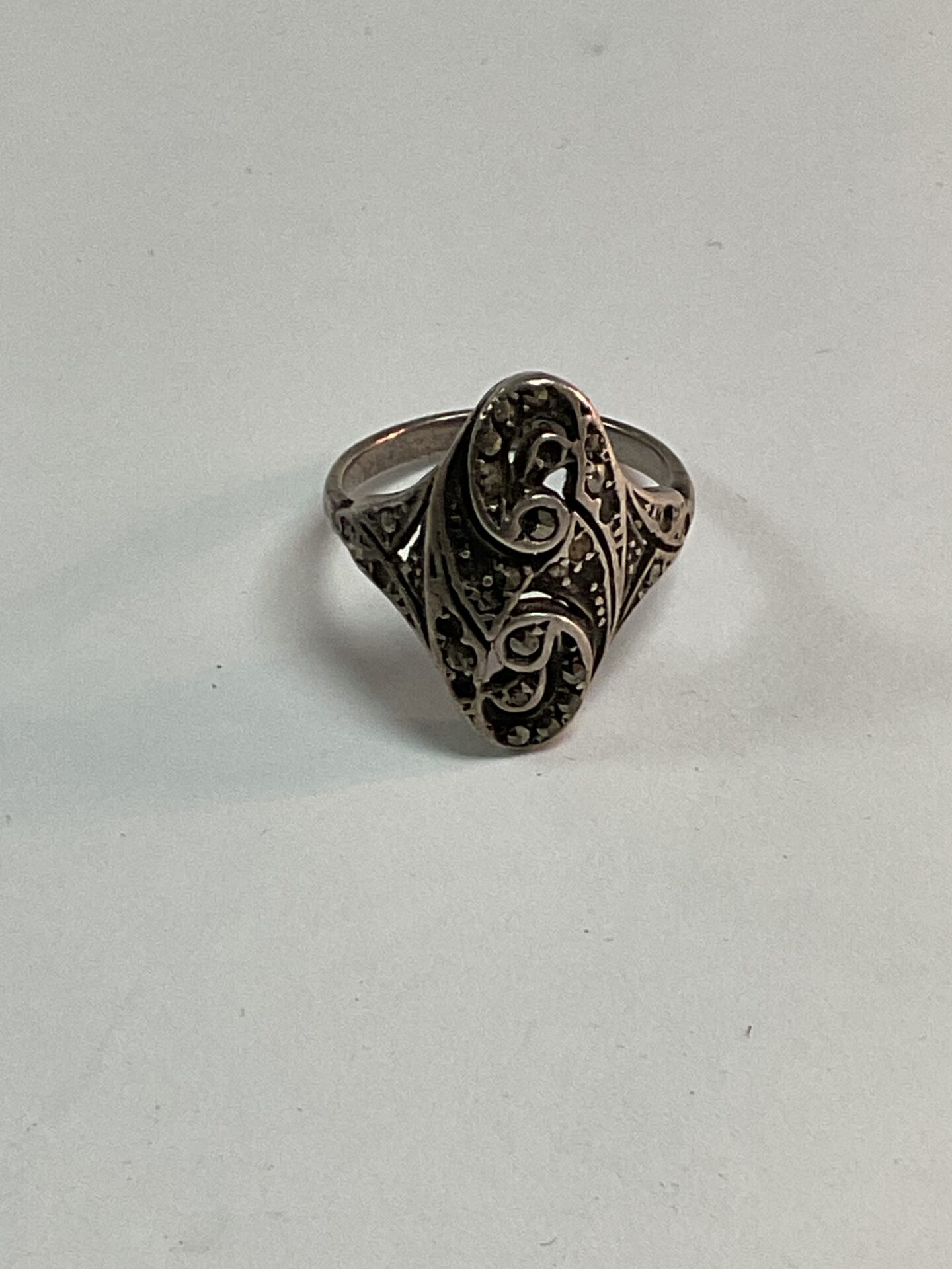 This ring shows signs of wear consistent with its age, which adds to its vintage charm. The marcasite stones appear secure, though a professional clean may enhance their sparkle. This ring would appeal to collectors of vintage jewellery, particularly those interested in marcasite pieces or art deco designs, and would make a statement piece for any jewellery enthusiast.