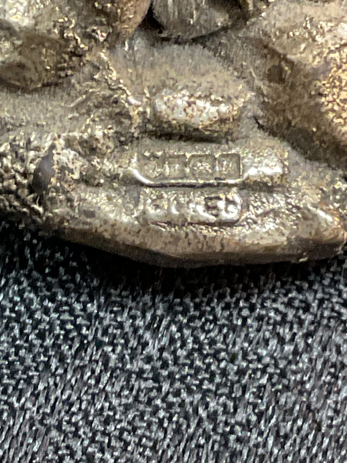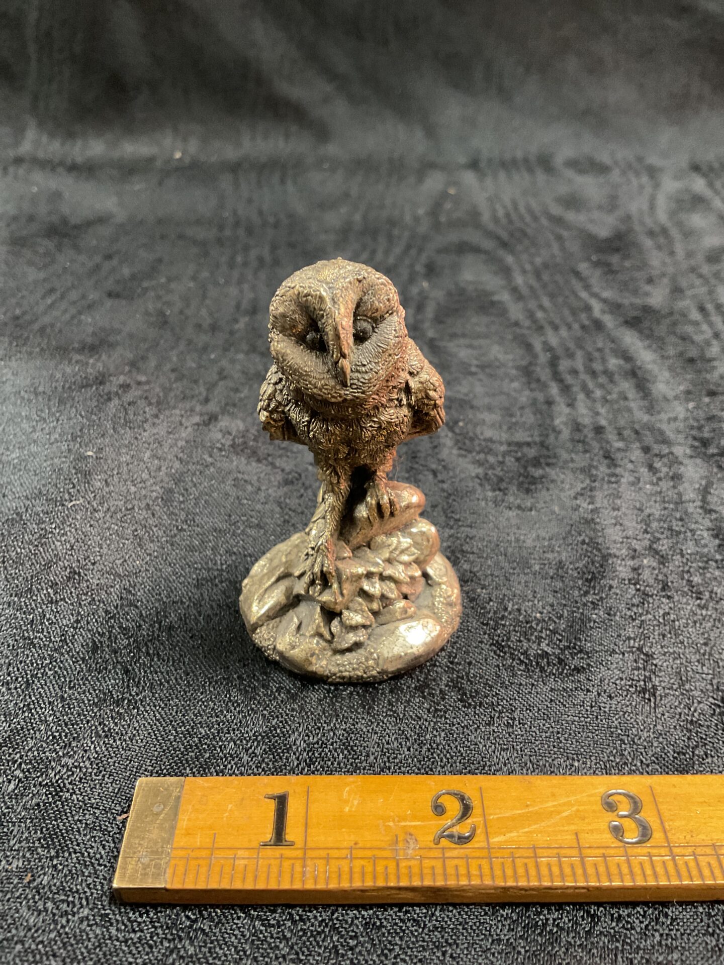 This is a finely detailed, hollow cast silver owl figurine, hallmarked for silver content. The sculpture depicts an owl perched, with textured feathers and a watchful expression. The figure is beautifully crafted, showcasing the skill of the silversmith and the attention to detail in capturing the bird’s anatomy and character.
