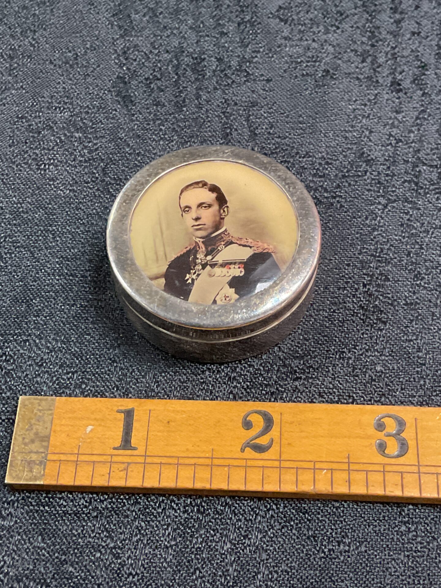 This is a small, circular pill pot crafted from silver plate. The lid features a detailed portrait of a military figure, likely dating from the early to mid 20th century. The pot’s interior is designed to hold pills or small items, and the silver plate finish adds a touch of elegance to this functional and collectible piece.