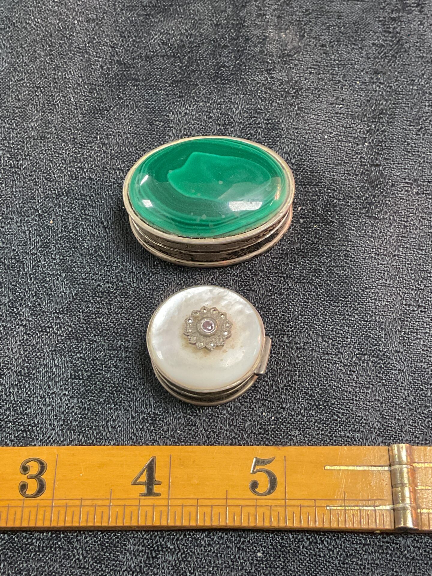 847 Two Vintage 925 Silver Pill Pots One Set With Malachite And One With Mother Of Pearl