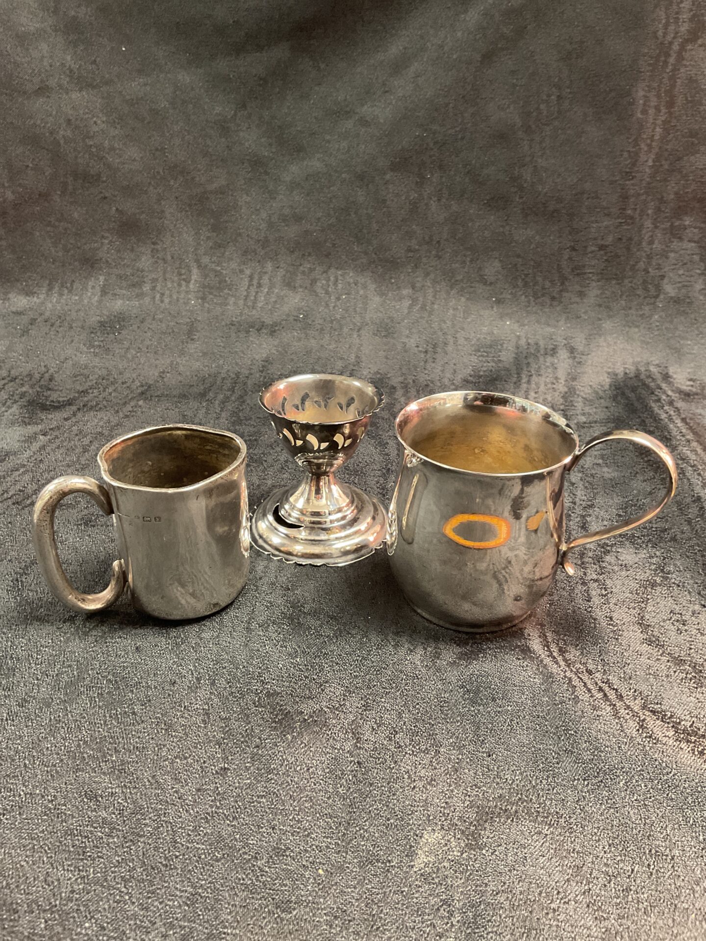 This lot comprises a hallmarked sterling silver jug, a silver plate egg cup, and a smaller silver plate jug. The larger jug is hallmarked, indicating its sterling silver composition, and features a classic, slightly tapered form with a handle. The smaller jug and egg cup are crafted from silver plate, offering a similar aesthetic to the hallmarked piece. This set presents a charming collection of tableware, suitable for display or use.