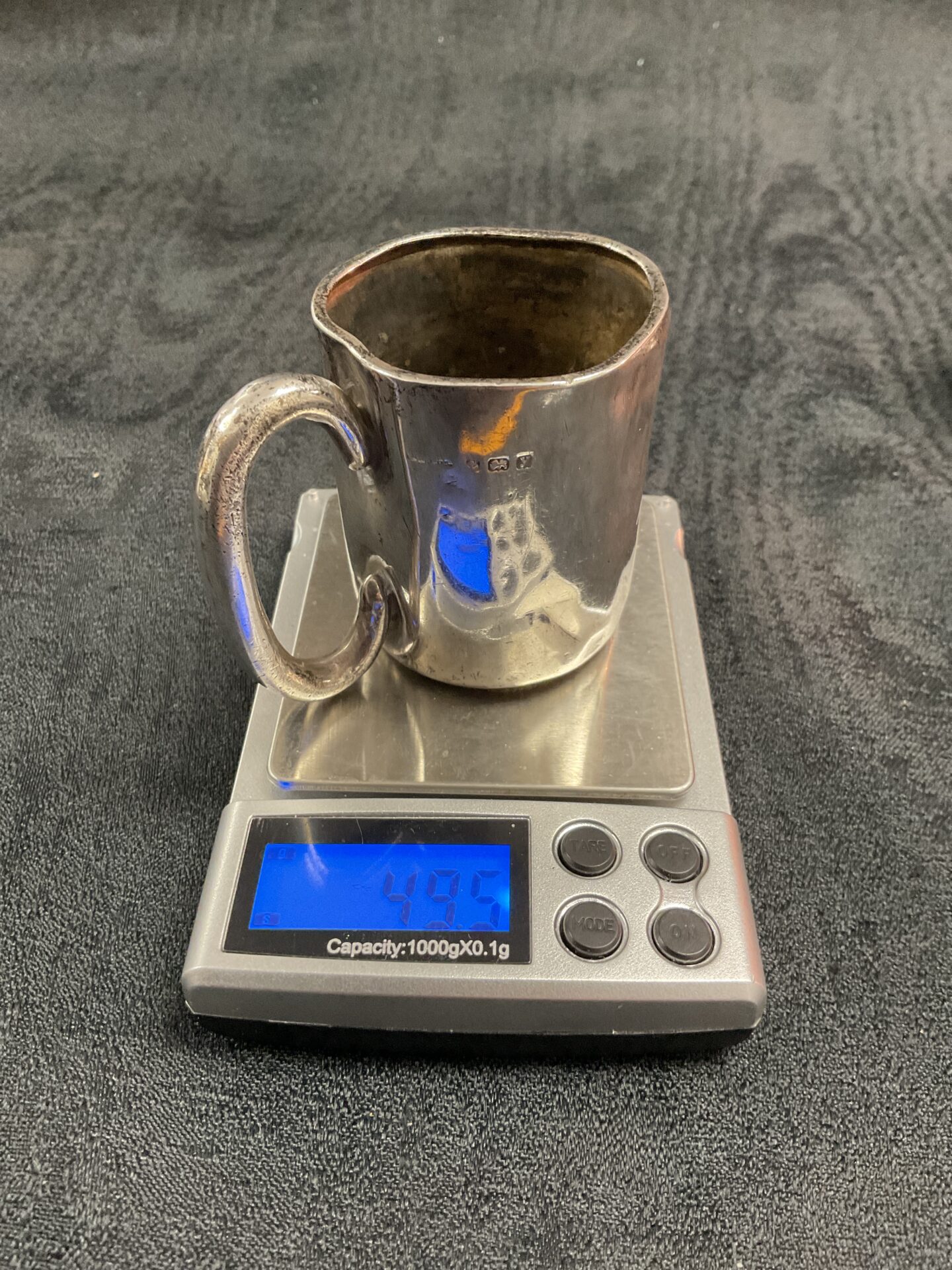 The items exhibit signs of age and use, with some surface wear and potential tarnishing consistent with vintage silver and silver plate. The hallmarked jug weighs 49.5g. These pieces would appeal to collectors of antique silver, those interested in vintage tableware, or individuals seeking unique decorative items.