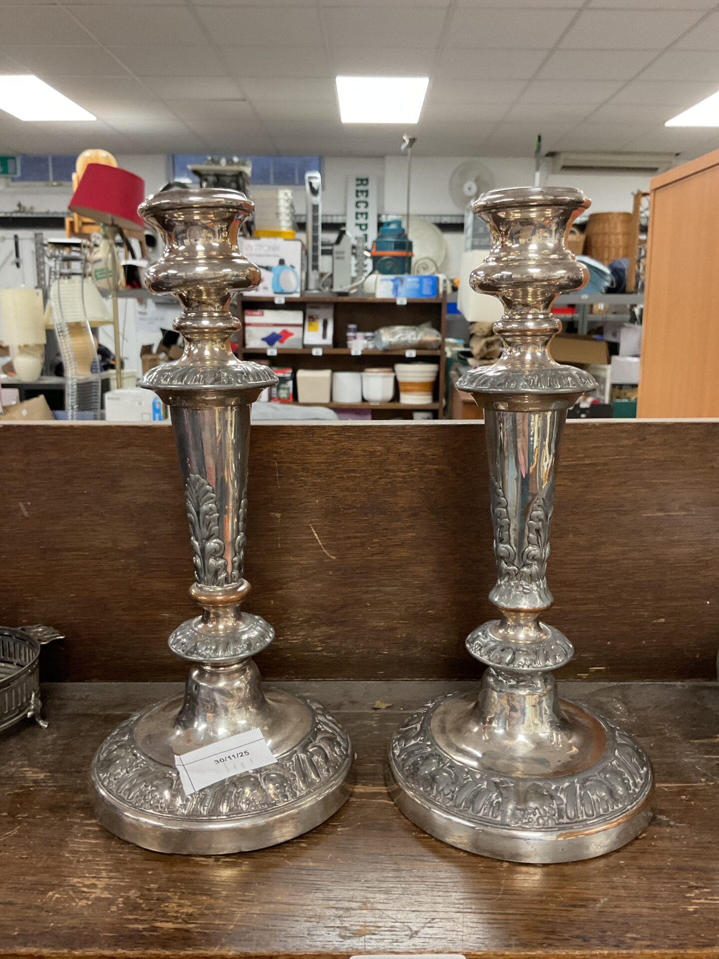 This pair of candle sticks are crafted from silver plate, exhibiting a classic design with ornate detailing. The bases are heavily embossed with floral motifs, and the stems feature a gently tapering form. These candlesticks would have been used to hold candles, providing ambient lighting and adding a touch of elegance to a dining table or living space.