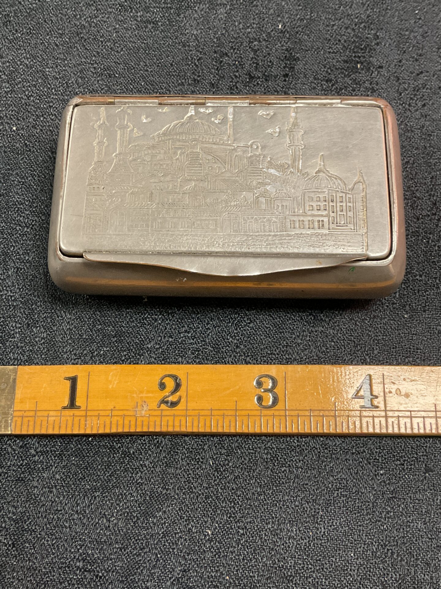 This is a small, rectangular cigarette tin crafted from silver plate. The lid features an intricate, engraved design evocative of Middle Eastern motifs. The tin’s construction suggests a period piece, likely dating from the mid-20th century, intended for holding cigarettes and offering a touch of elegance to the smoking experience. The detailed engraving and quality of the silver plate suggest it was once a valued personal accessory.