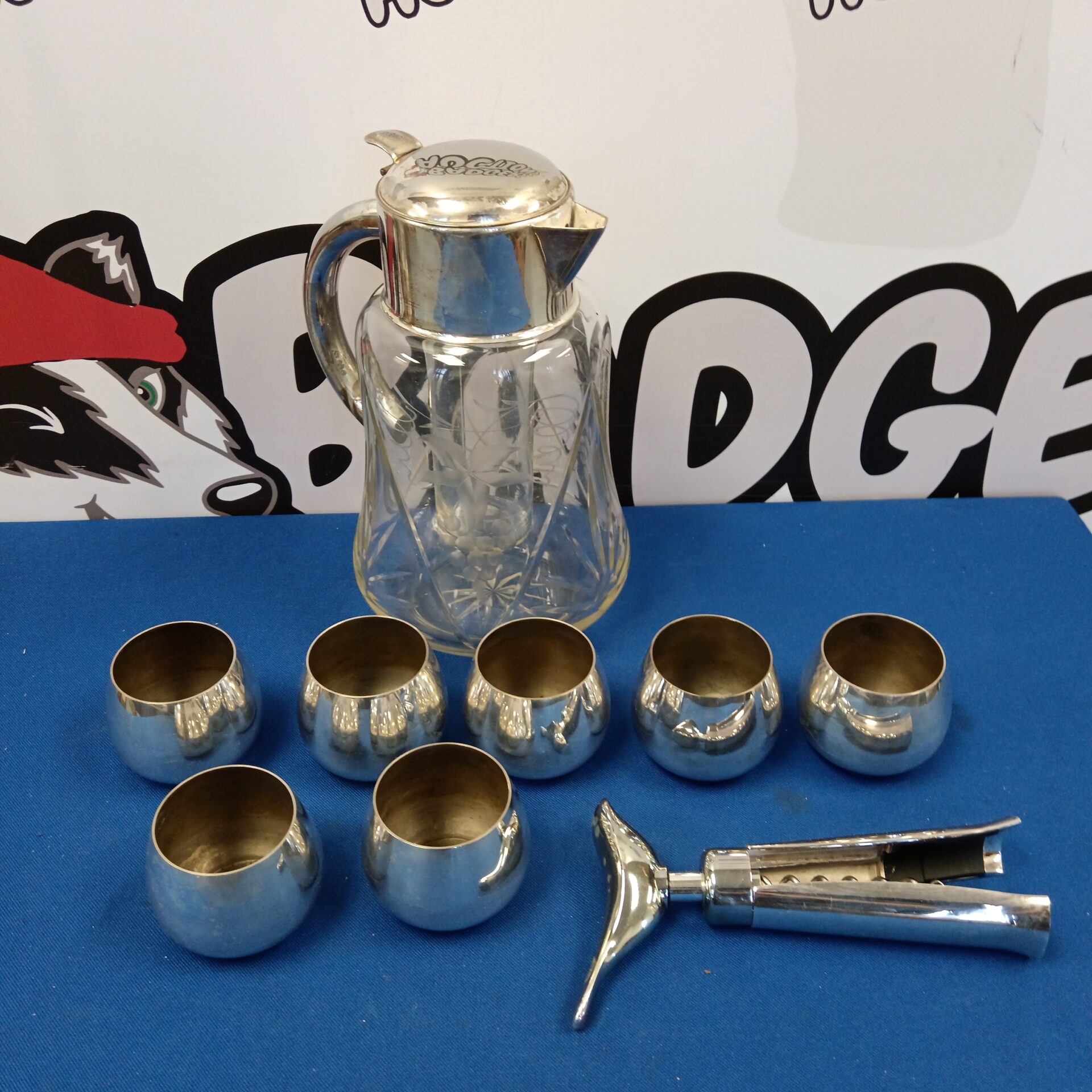 This elegant set features a cut glass pitcher with a silver plate topper, accompanied by a collection of Wm a Rogers cups, also with silver plate rims. The pitcher exhibits a classic form, likely intended for serving beverages, and the cut glass design adds a touch of sophistication. The cups complement the pitcher beautifully, creating a cohesive and refined serving set for entertaining or display.