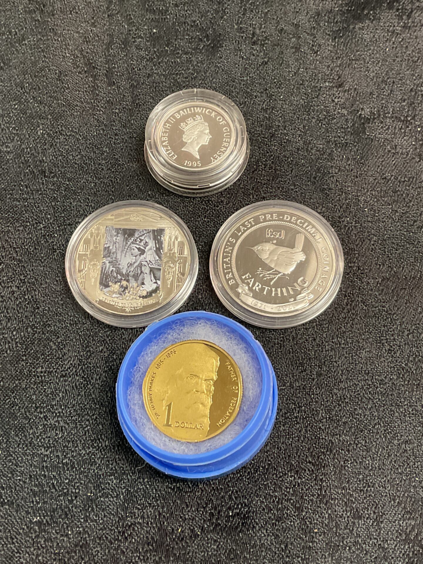 This lot comprises a selection of silver proof coins. It includes a 1995 £1 coin commemorating the Queen Mother, two 2021 Gibraltar half crowns, and a 1996 Australian Father of the Federation dollar. These coins are presented as a collection for enthusiasts and collectors of numismatic items.
