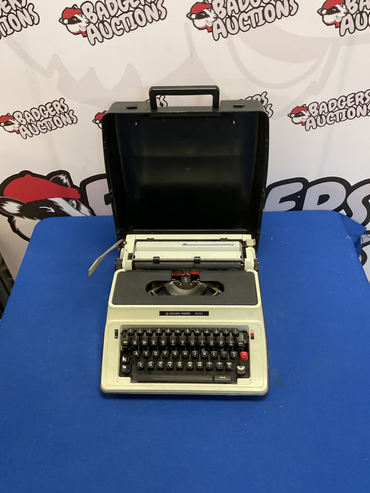 This Silver Reed 500 typewriter presents as a vintage item with signs consistent with age and prior use. It may require cleaning and servicing to restore full functionality. This typewriter would be of interest to collectors of vintage office equipment, enthusiasts of retro technology, or those seeking a unique decorative piece.