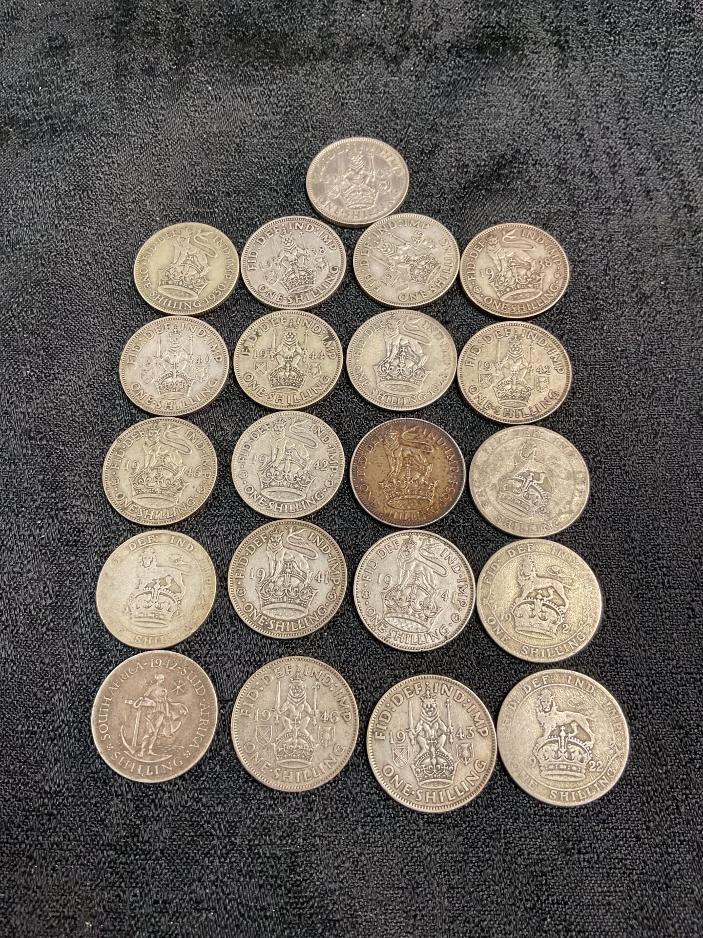 This lot comprises twenty-one silver shillings, dating from 1922 to 1946. These coins represent a period of British pre-decimal currency, crafted from a half-silver alloy. The shillings showcase the portrait of King George V and King George VI on the obverse, and the crowned lion on the reverse, typical of the era. The total weight of the lot is 117g.